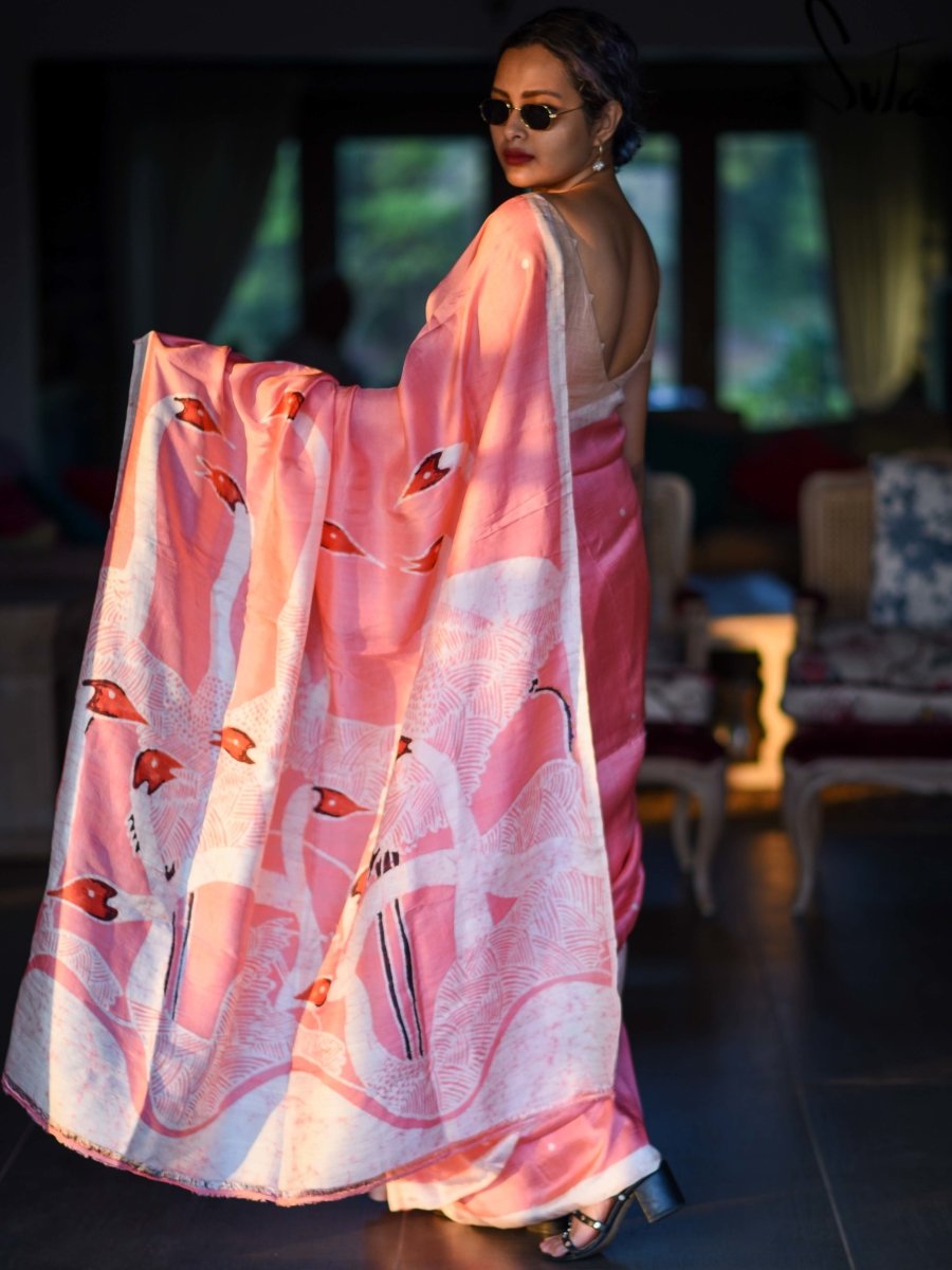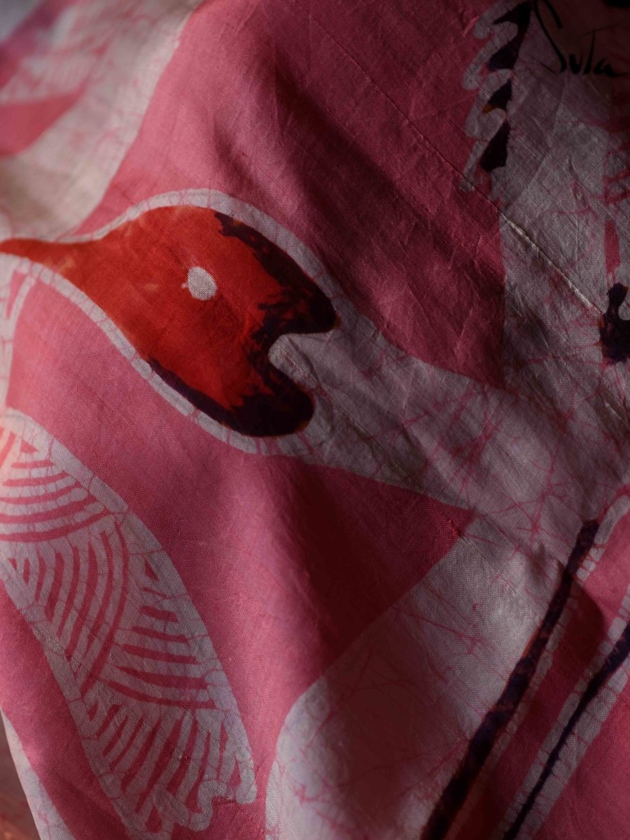 This pink-hued handloom mulberry silk saree with free-hand Batik design is an experience to remember!