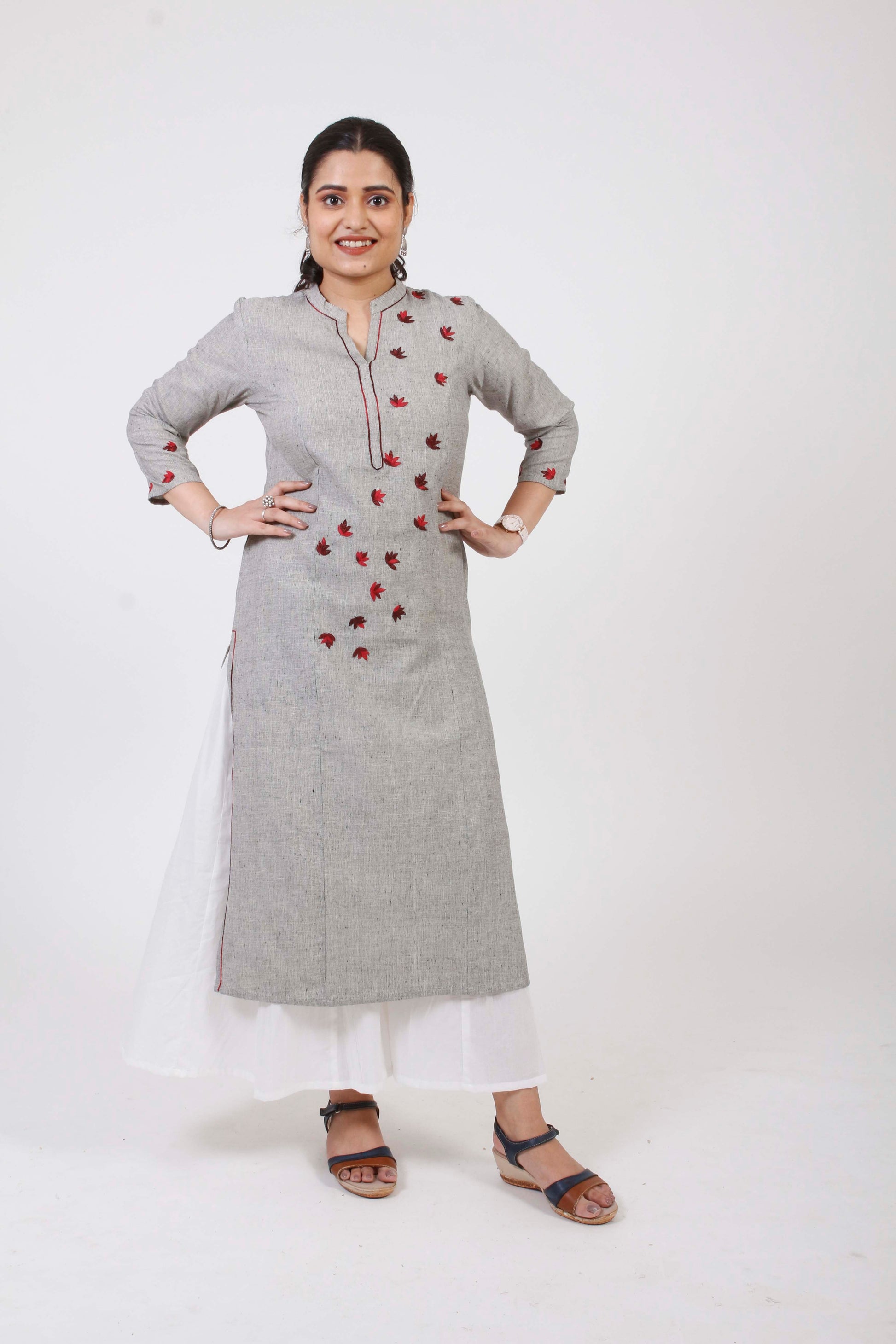 A Grey kurta with pockets for your essentials, crafted from Cotton Handloom Fabric. The flattering silhouette with its collar neck has been hand Embroidered .This classic design can be effortlessly for workwear and family functions.