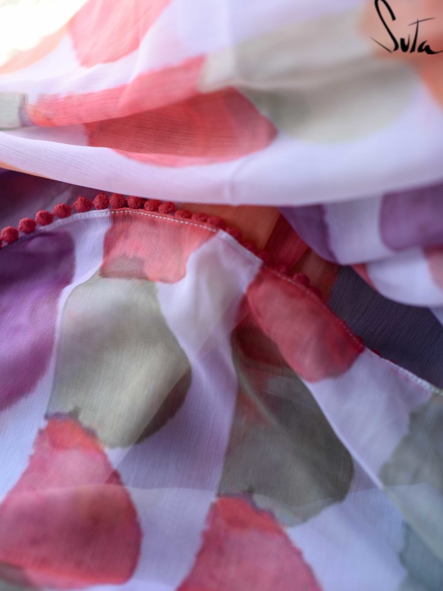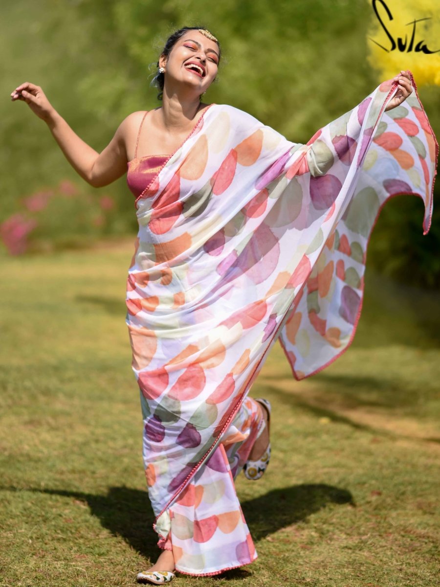 The sarees in this collection come alive with colours as the spirit of Holi takes over. The designs are inspired by the different beautiful elements that this festival is associated with. From pretty bubbles, splashes of colour to the riot of rainbows, the designs exude a fun, bright, lively vibe that will lift you up and dance with you as you let the child in you break free! Digital printing is used to print the designs on poly-chiffon fabric and this new-age method brings the charm of prints and the convenience of technology together. In this method, designs from a computer or any electronic device are directly printed onto the fabric. Digital printing is considered to be a major evolution in printing methods and has opened up varied design possibilities with it. The delicate lace on the border of the sarees add just that touch of charm that you can resist!