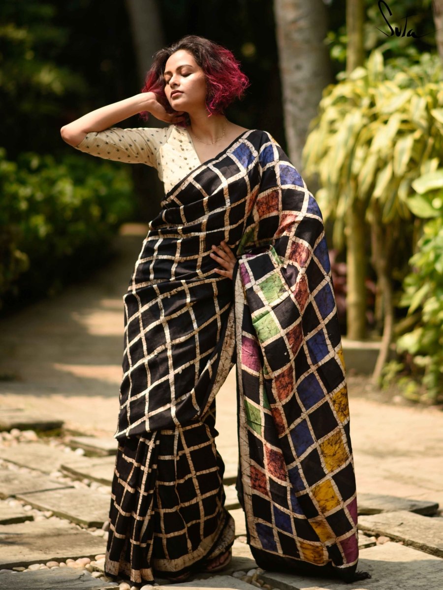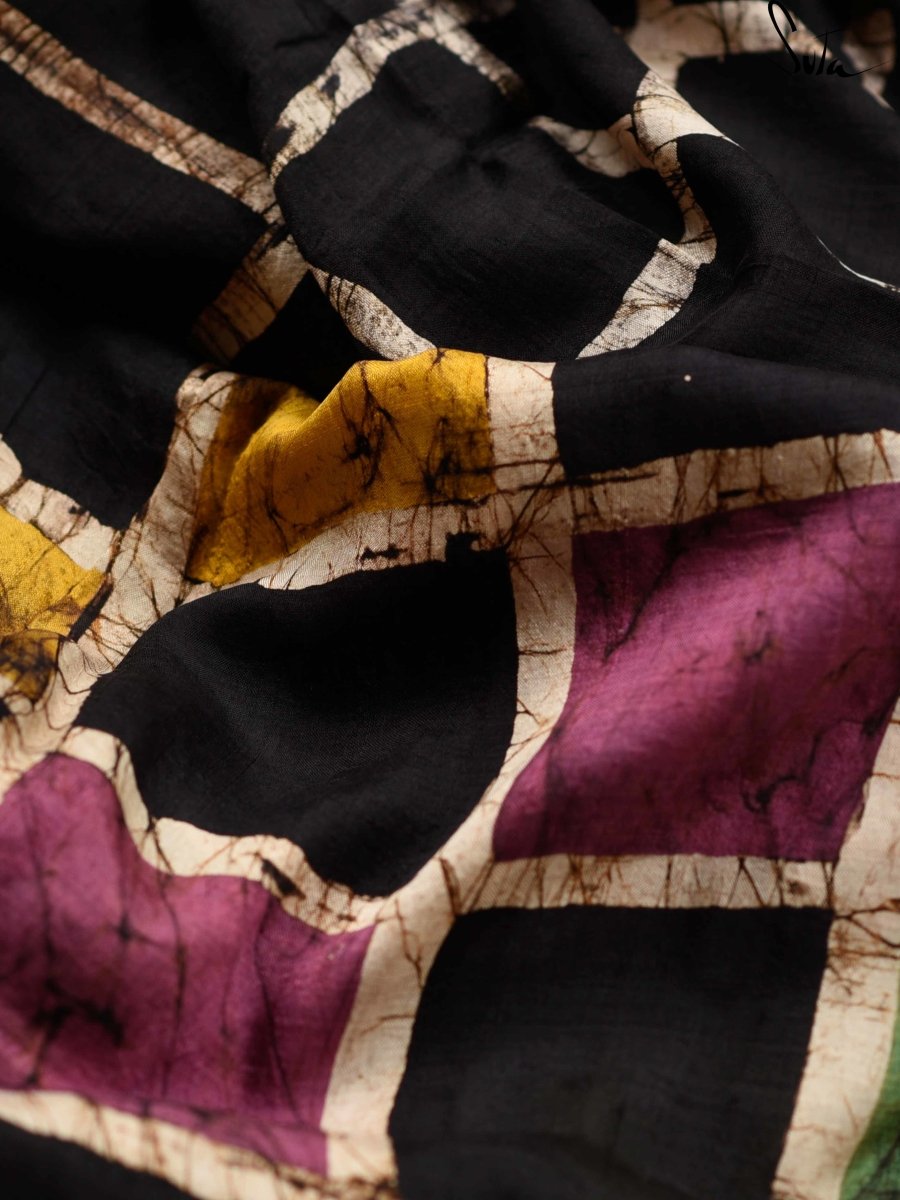 This hand done Batik Mulberry silk saree in black, red, yellow, blue and off-white hues is a dream come true!