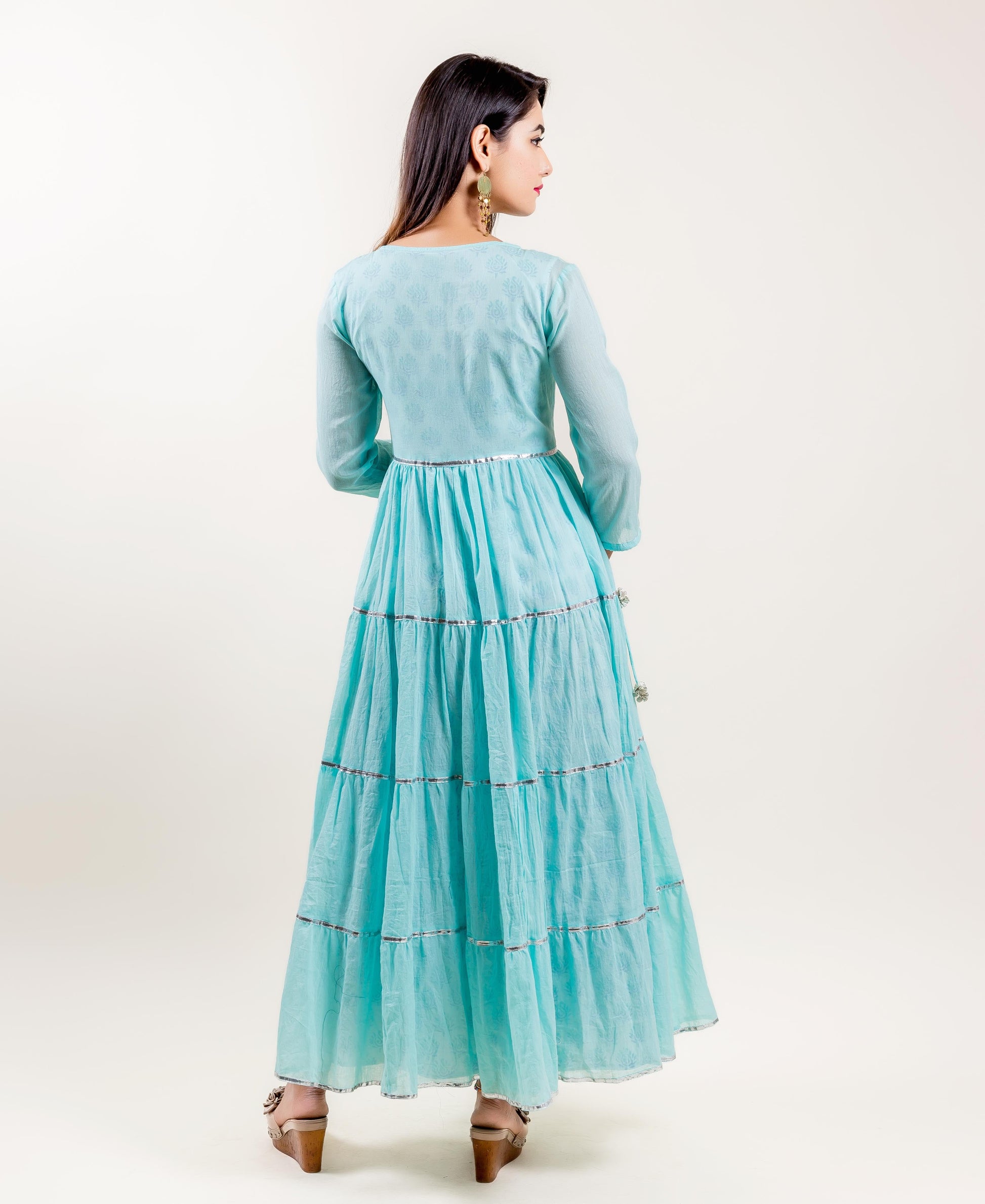 Aqua Cotton Tiered Indo Western Dress with Sleeveless inner