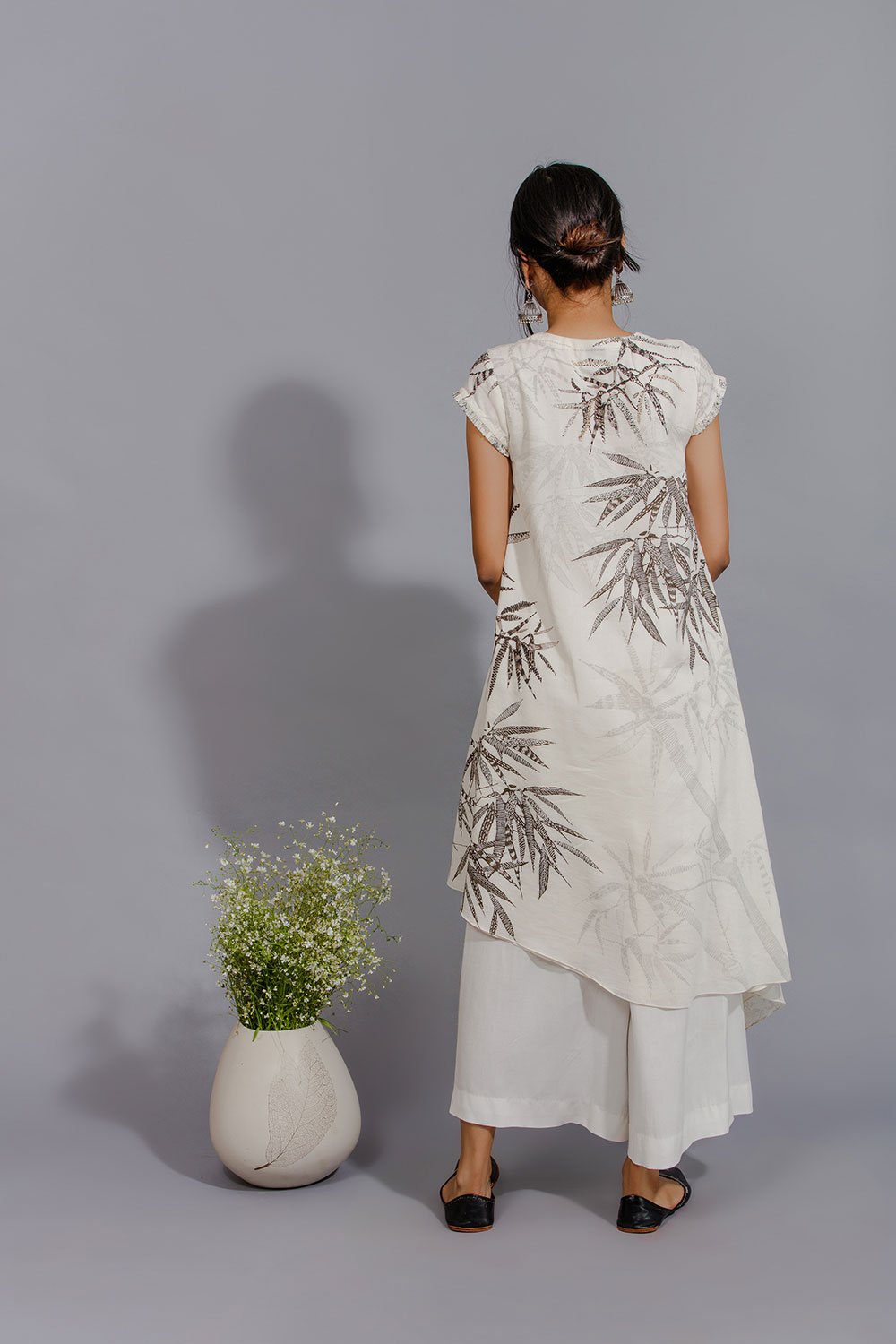Stunning Shadow Print Asymmetrical Silk Chanderi Kurta With Pleated Trim On Cap Sleeve