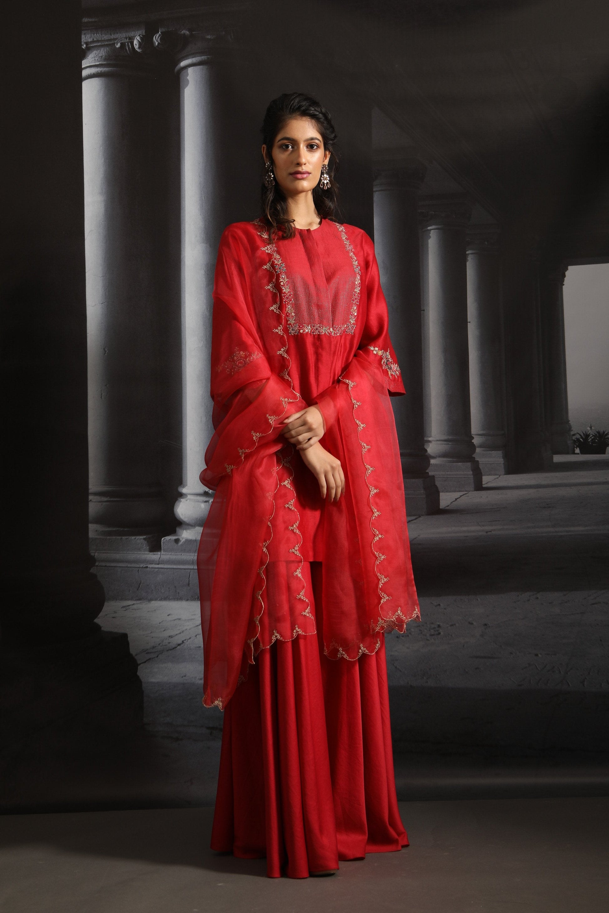 Asymmetrical Embroidered Red Chanderi Kurta With Matching Flared Cotton Satin Pants and Scalloped Embroidered Organza Dupatta