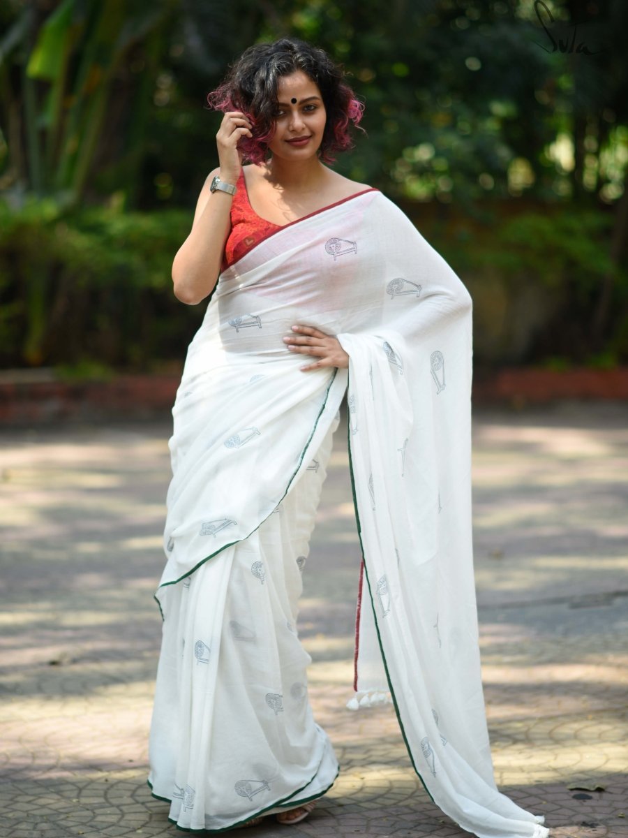 This gorgeous drape with red, black, green and white hues in made-in-heaven mul with hand block-printed design is irresistible!