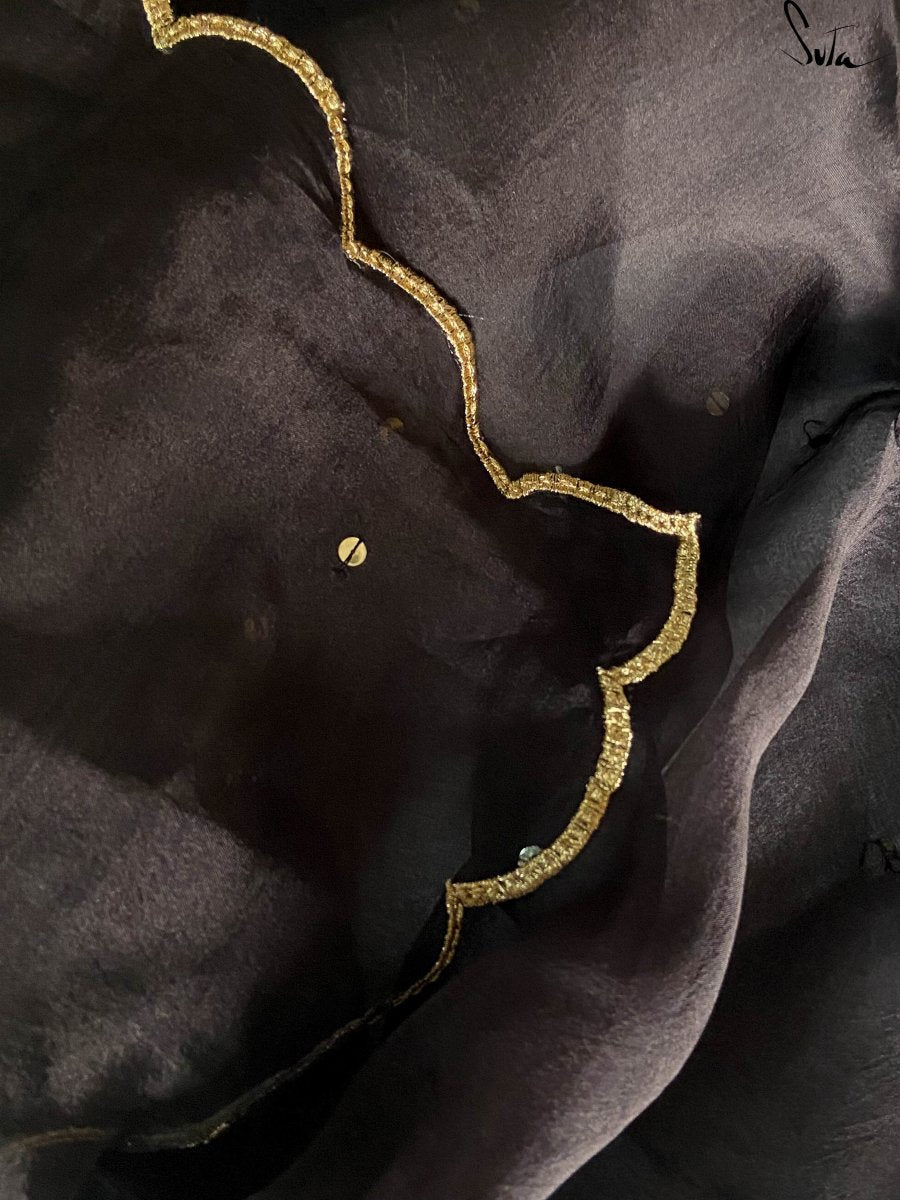This black organza silk drape brings the night sky alive with the stars of chumkis shining bright! The embroidered scallops add charm