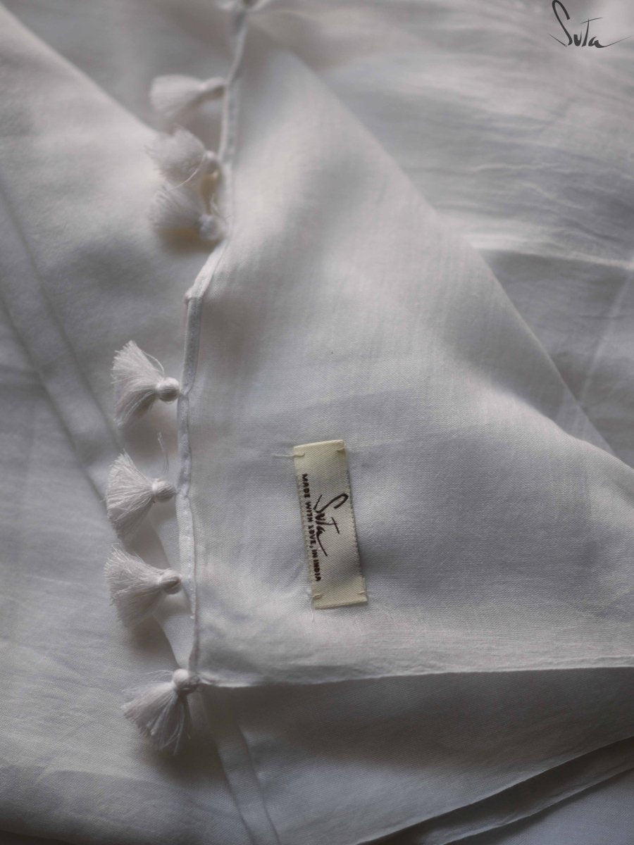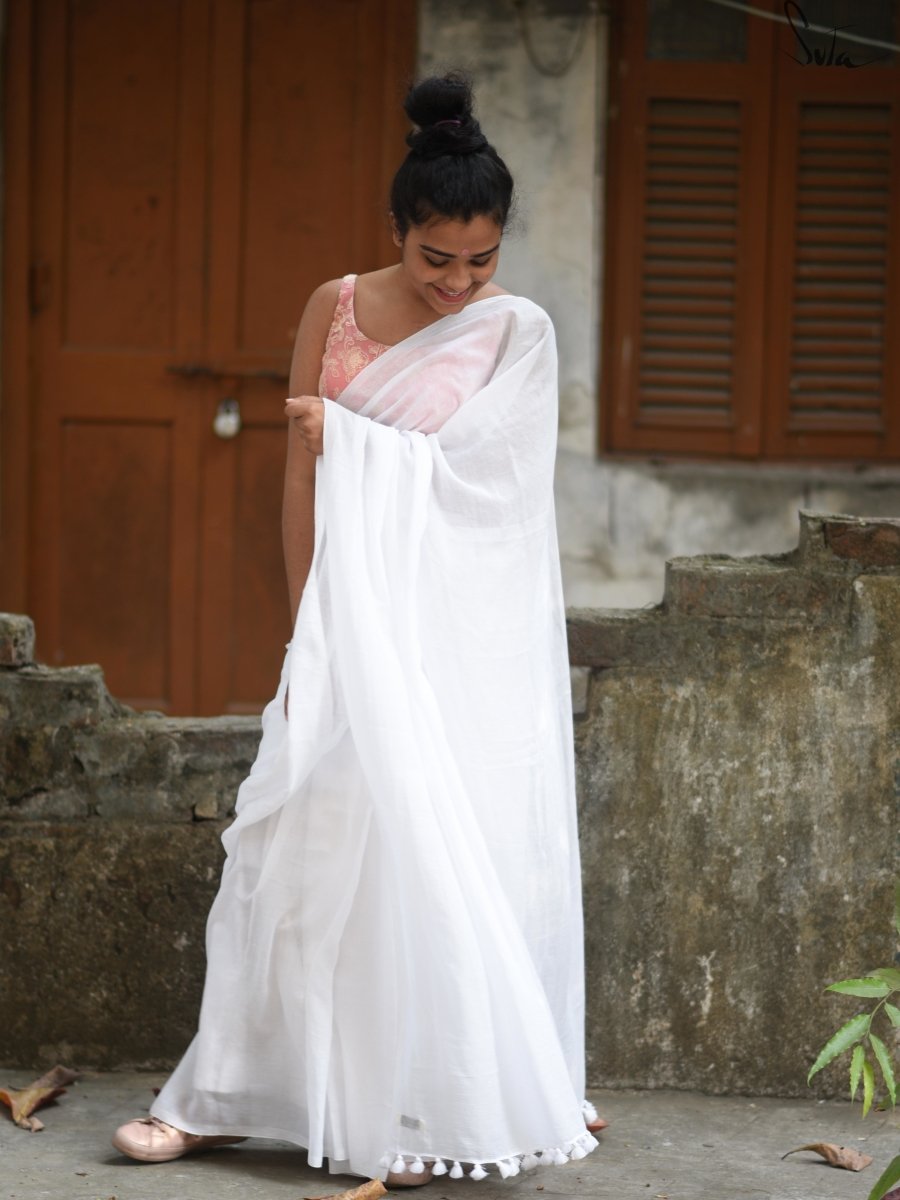 This pure white saree made of Eucalyptus and Made in Heaven mul yarns is simply magical. This will easily make it to your list of favourites!