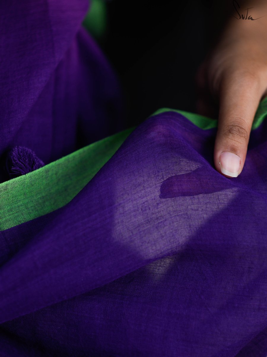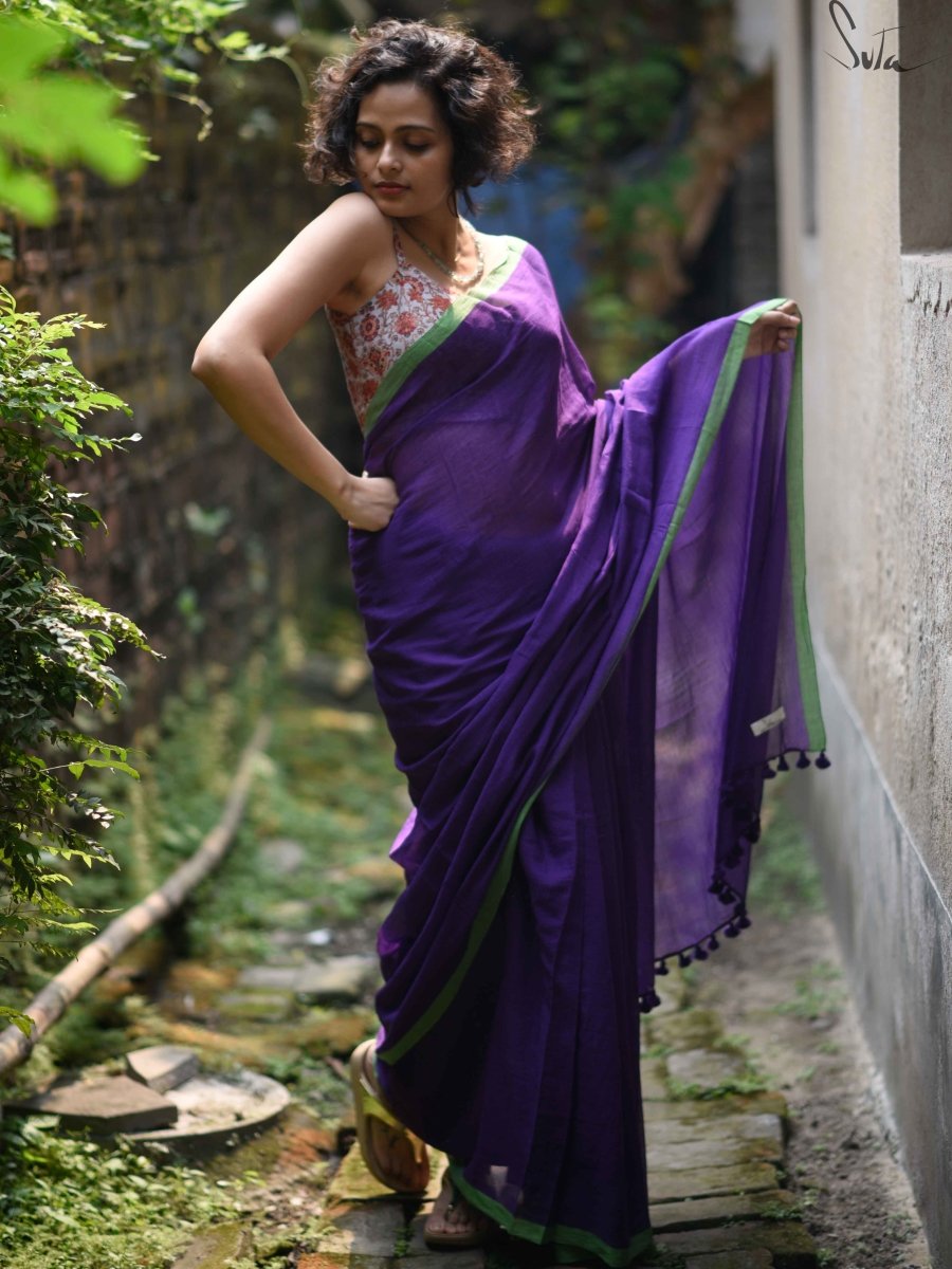 She had that ruggedness that only people who work in the fields can have. Her tiny vegetable farm became the perfect backdrop for love to blossom. As the city bred guy discovered the charms of this village belle, the beetroots turned a shade darker. As he helped her stack up the fresh Brinjals, the purple cupids made their hands ‘accidentally’ brush against each other and beamed at a job well done! This striking combination of deep purple with a thin green border in our made-in-heaven mul is a total winner !