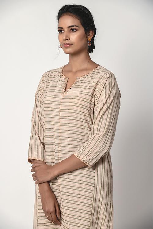 Beige dobby stripe kurta with gazette detailing on the sides along with desert embroidery