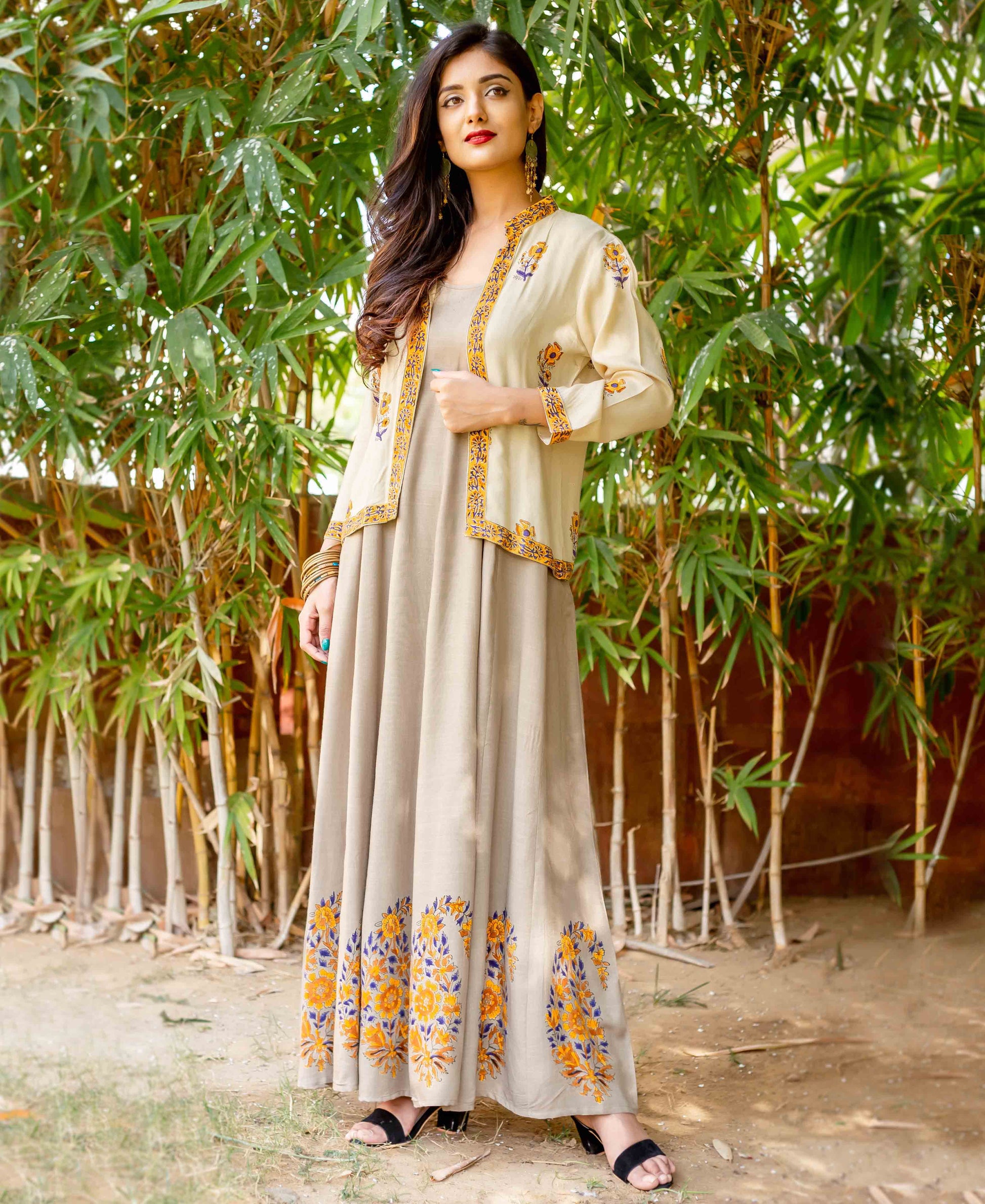 Beige Rayon Designer Dress with Detachable Printed Jacket