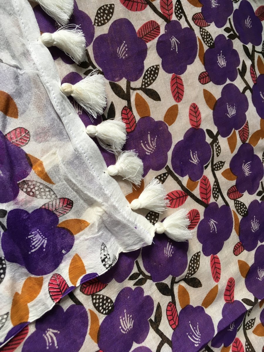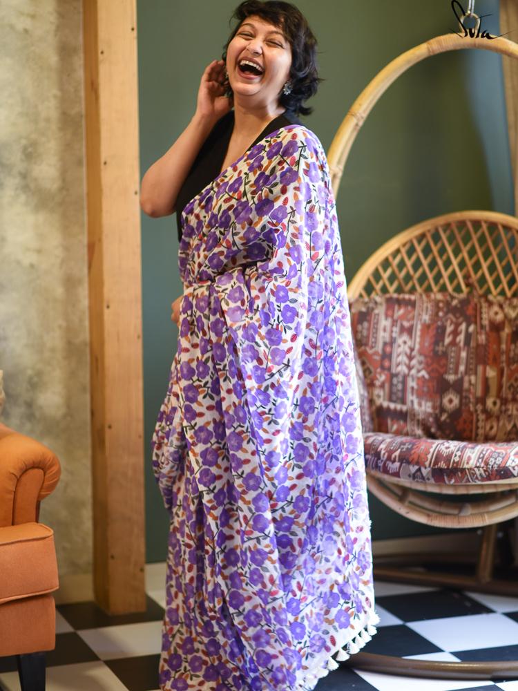 This amazingly beautiful made-in-heaven mul cotton saree with block-printed design in purple, pink and mustard is a dream come true!