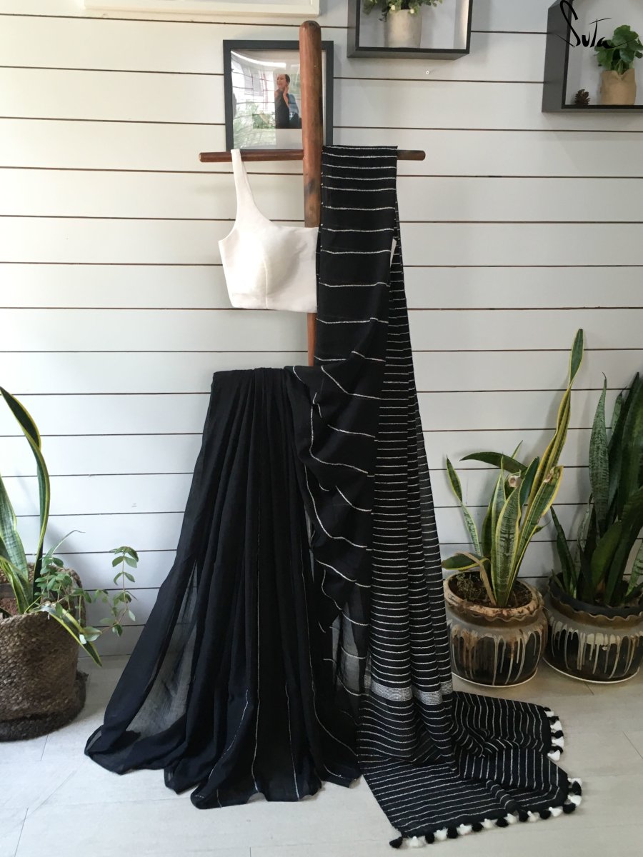 When artisans cant sell their cotton sarees they tear them off into fine cotton shreds and weave them into another cotton saree. This recycling gives birth to a Khesh saree. Perfectly destarched mul cotton saree- godly