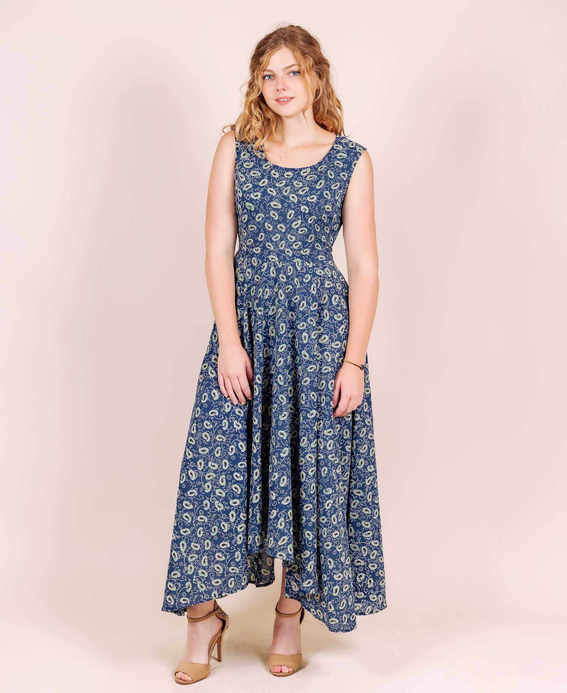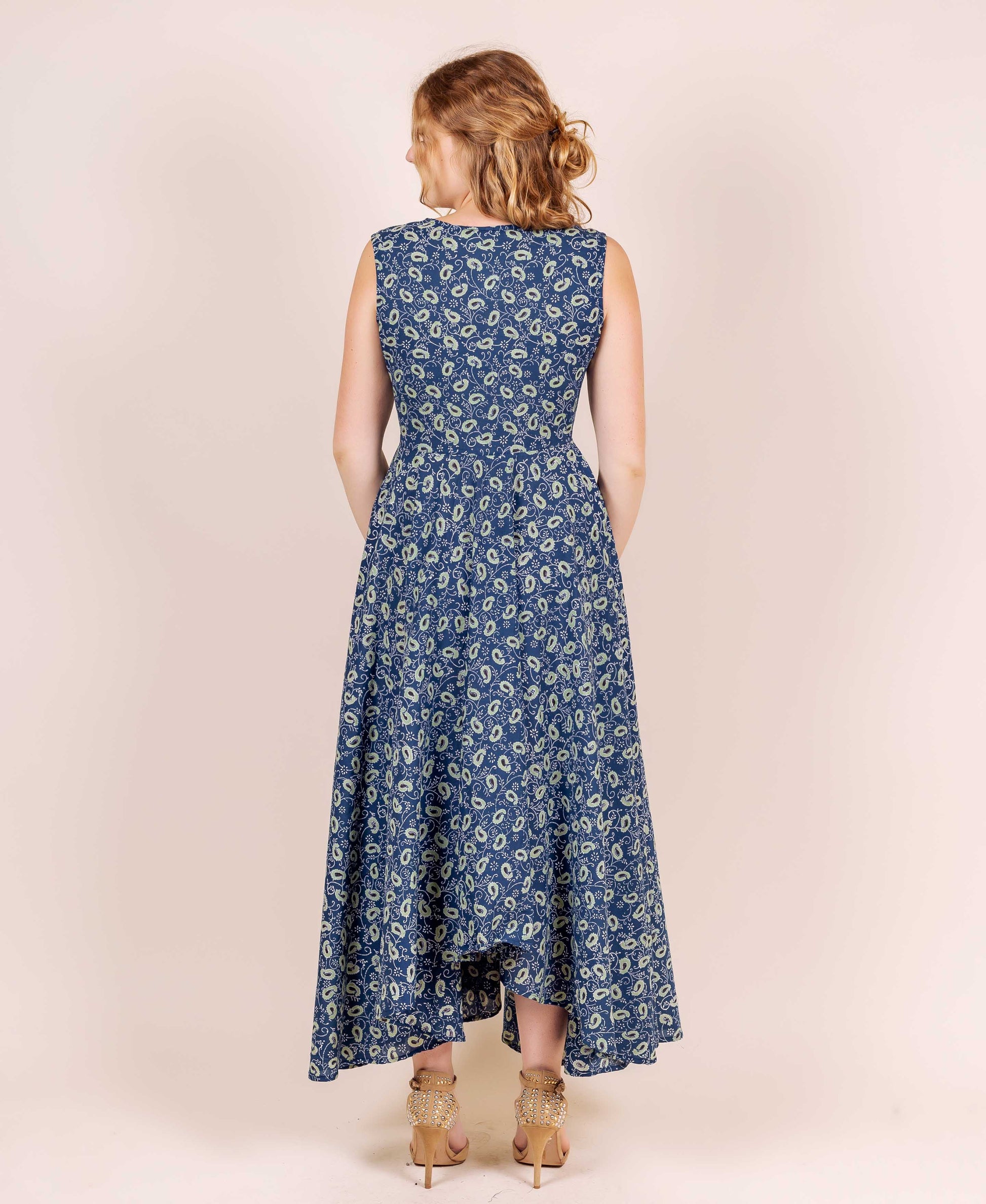 Floral Blue Sleeveless Hand Block Print High Low Flare Dress