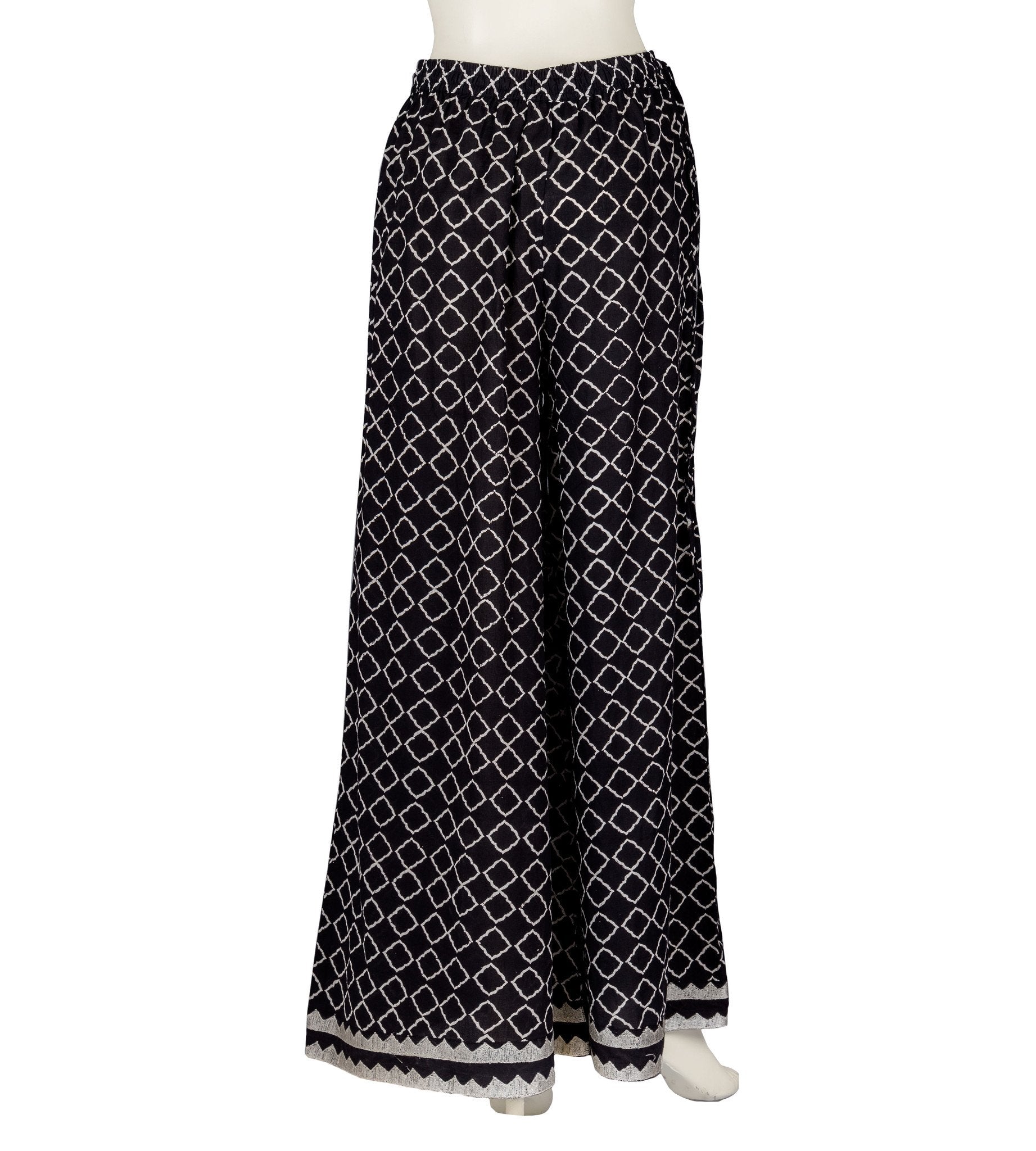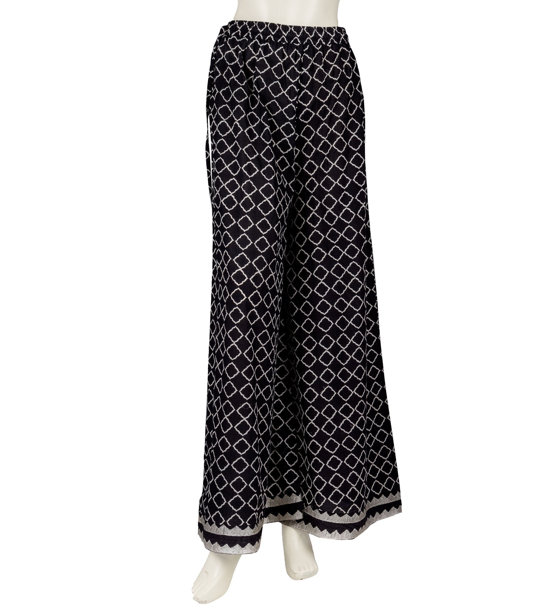 Stylise your favourite black colour with chicness and poise with this Retro style temple embroidered hand block printed wide leg palazzos from the new arrivals fashion collection at the fashion house. This retro geometrical triangle style wide leg palazzo will create a picture perfect look when you club it up with your fawn white high slit flared c cut indo western dresses. The temple embroidered sweep given to these palazzos will give a contemporary look to your entire outfit.