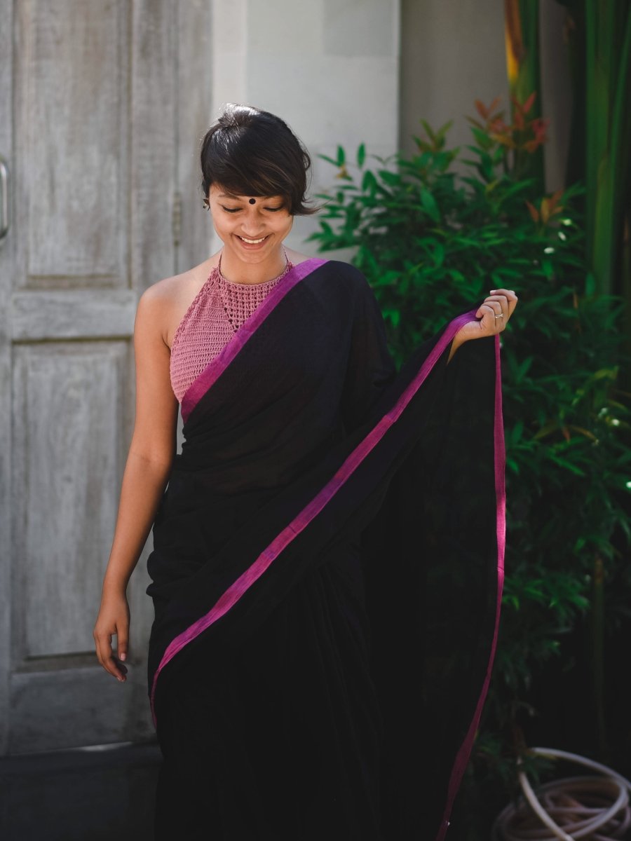 This super gorgeous black made-in-heaven mul saree with a dash of pink is a must-have!