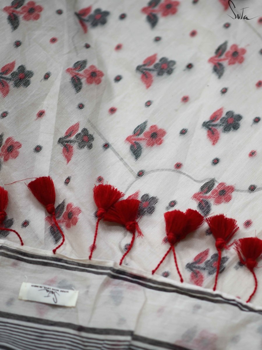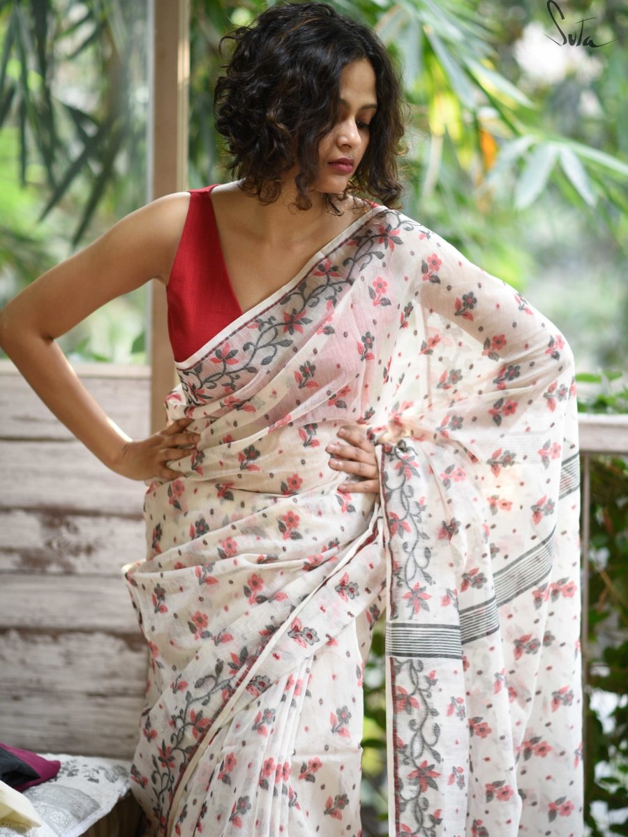 This white, peach and black saree is an amalgamation of beautiful shades from the colour palette and elegant design.