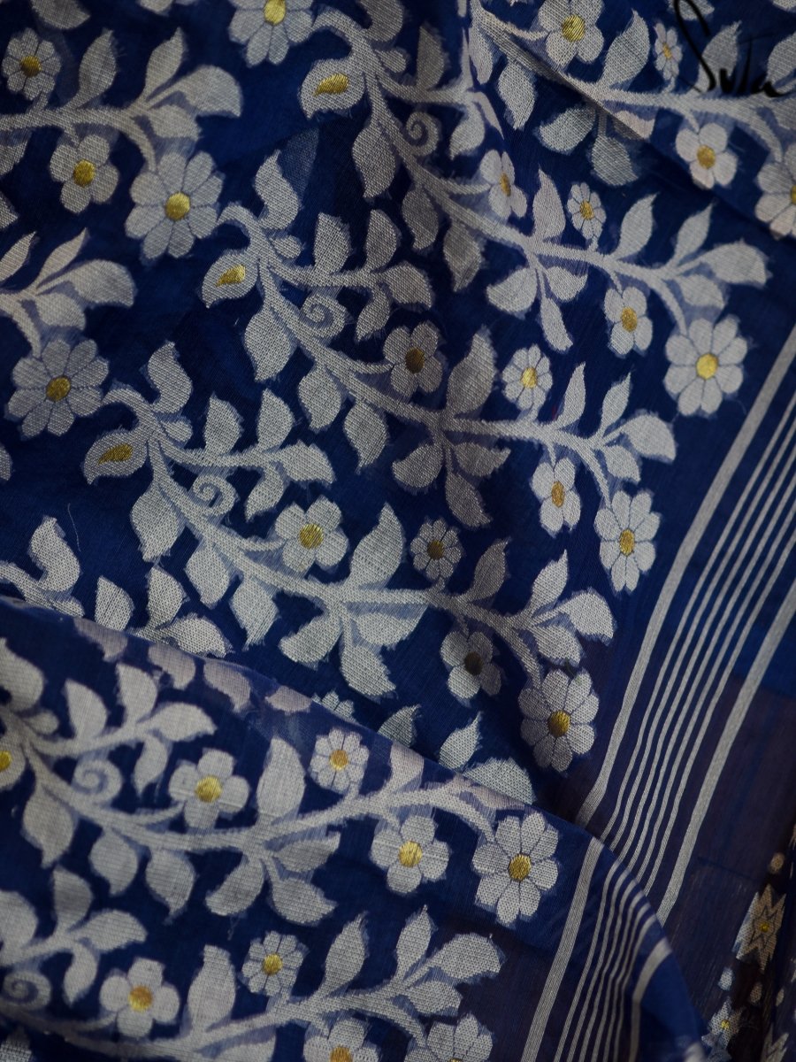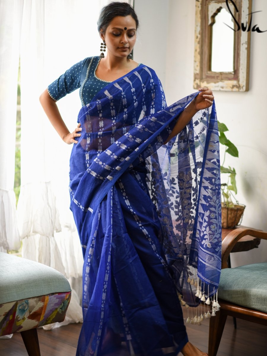 This saree is made of a gorgeous fabric that is a blend of cotton and polyester, hand-woven on a Jacquard handloom. Here, a set of punch-cards are attached to handlooms to sort the weaving patterns. This makes it easier and faster for weavers to weave the fabric to life. The saree is fluid, soft, falls amazingly well and embodies the charms of handloom fabrics.