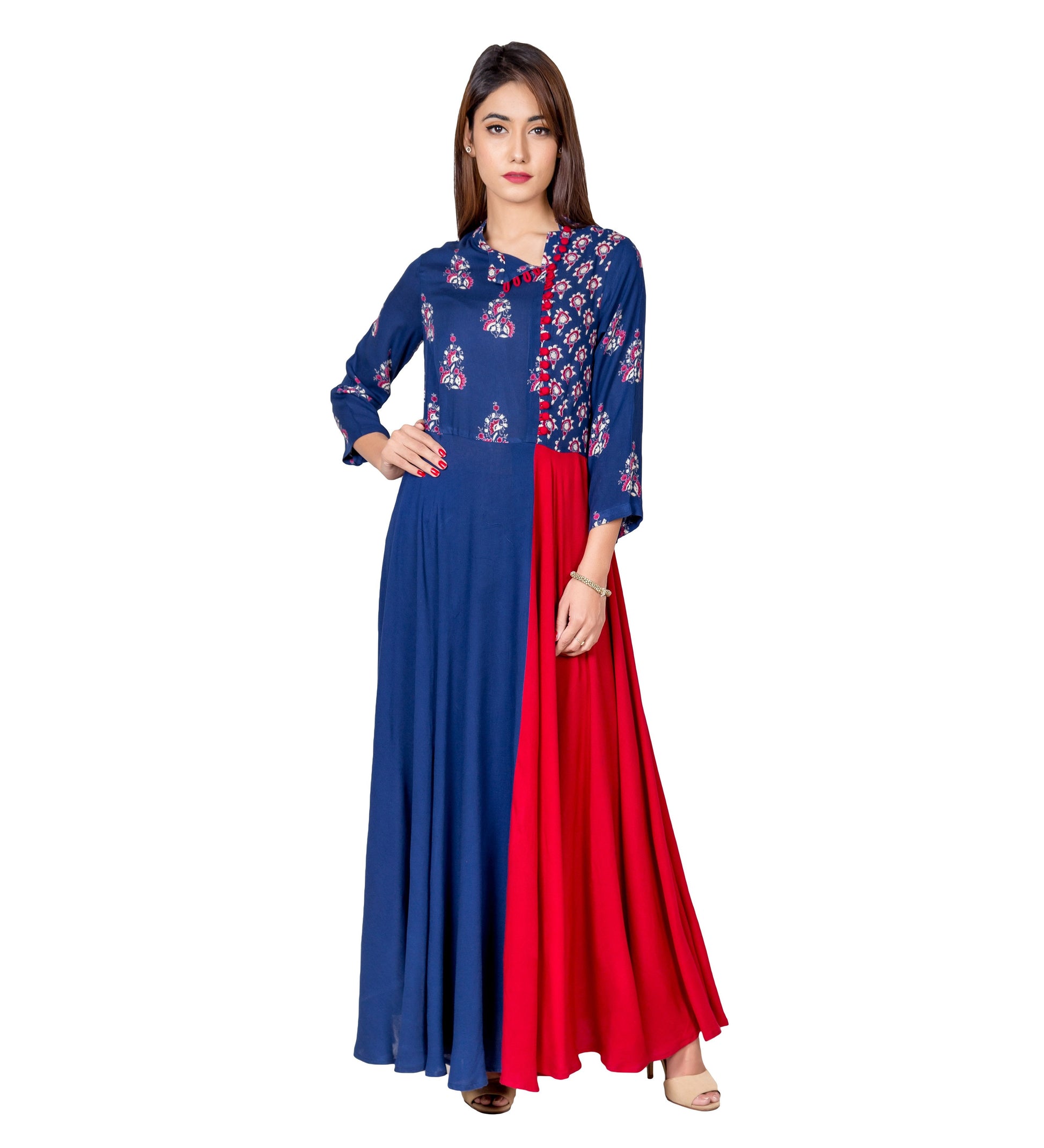 Add on the bling of color and splash into your fashion closet with this blue and red hand block printed indo western long dress from the latest designer Indian fashion house of . It is Flashy yet elegant with the jawahar or collar style neck pattern and three fourth sleeves. This blue and red dress is pure cotton fabric which is easy for you to use and maintain. The flare and the flow this dress will give your aura will take for a whole new world.