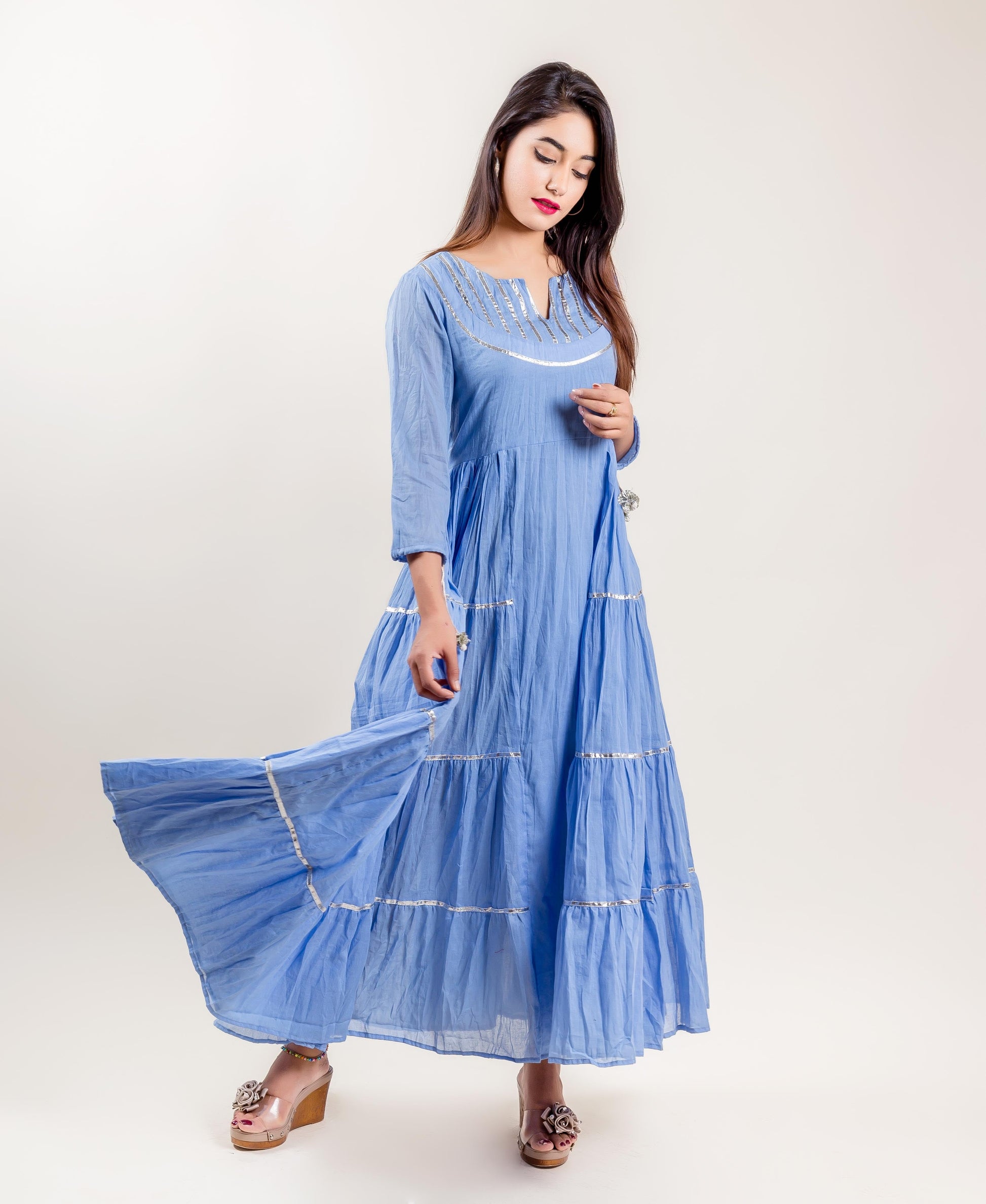 Cause a chic scene by choosing this magnificent indo western tiered dress in blue for you next outing. Flaunting quarter sleeves, tiered styling and round neck with V-slit, this dress has been fabricated by lightweight cotton. With the silver gota trim designing and great fit, it will mark a landmark in your ever-stylish history.