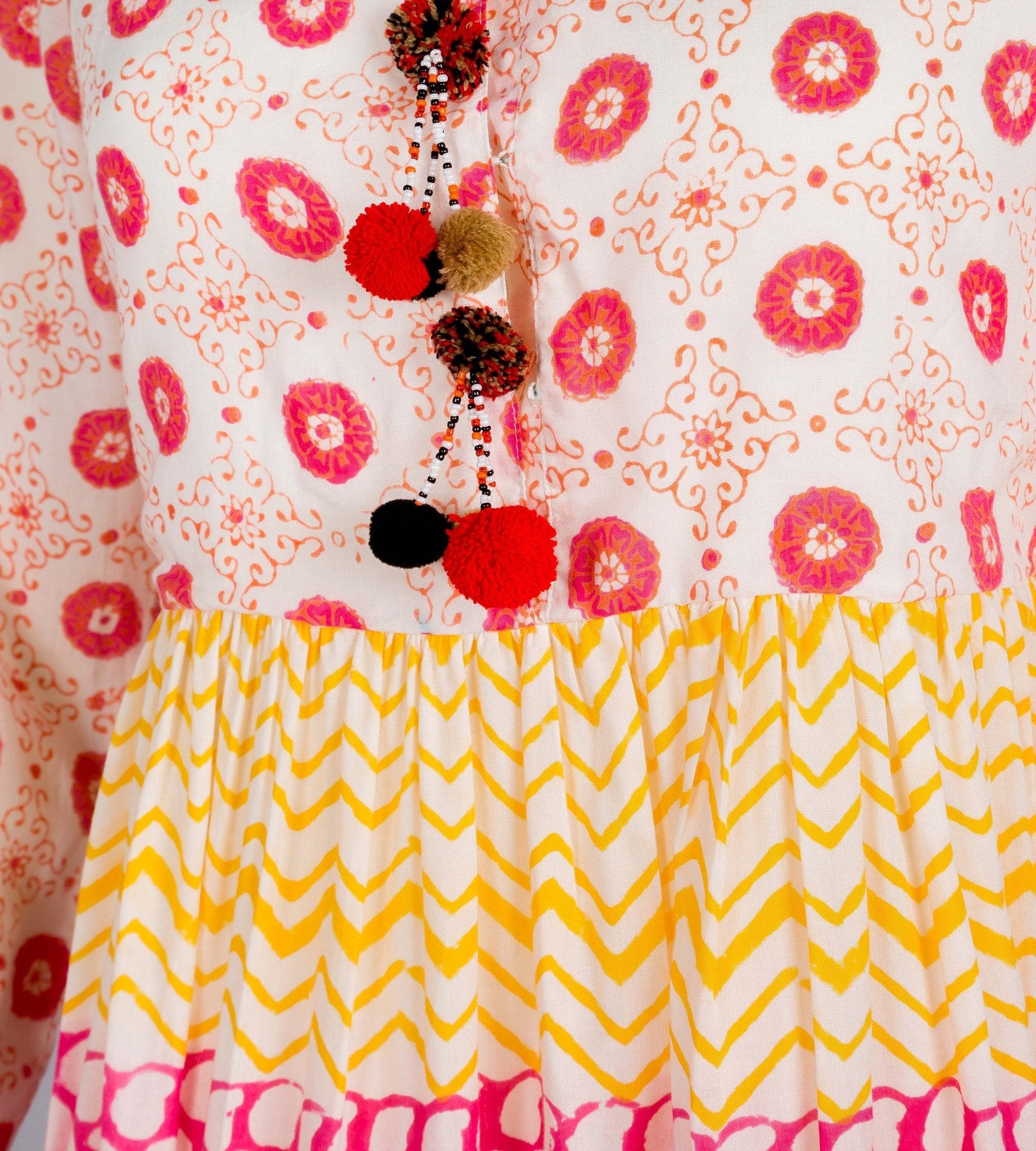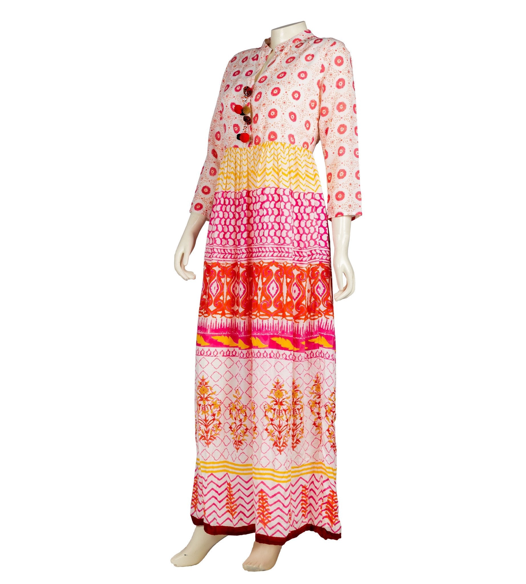 If you like softness and plush fabric then you should certainly go for this mesmerizing modal cotton empire cut floor length blouson dress in multi coloured layered pattern from the fashion house of . This beautiful floor length dress has the front panel tassels with tribal buttons giving it an exclusive front look. This pretty vintage style indo western dress is a must wear for all the stylish you who like it simply fashion fabulous.