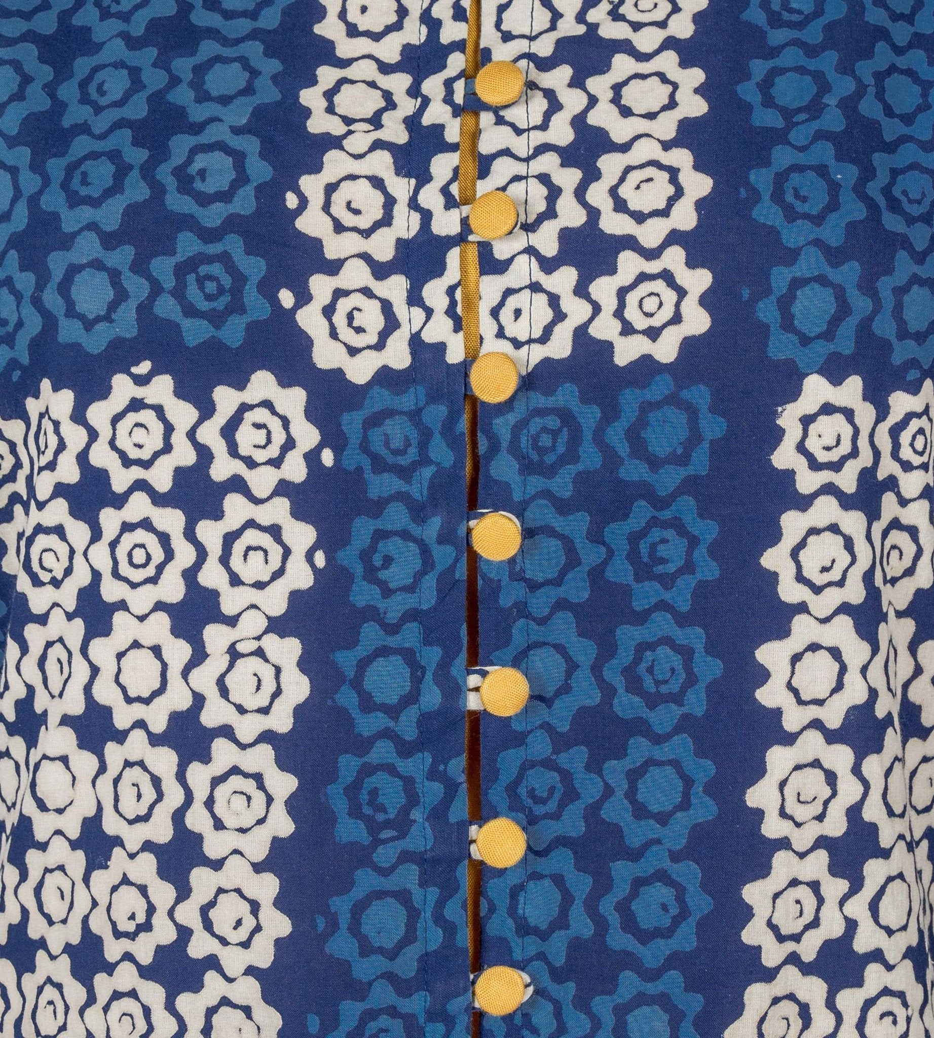 Be the fashion diva, with flamboyance of this indigo blue and yellow combo indo western dress from the brand new fashion arrivals at . This dazzling pure cotton block printed c-cut upper is beautifully printed with geometrical patterns and yellow potli button in the front panel. The inner is provided in bright solid yellow. The three- fourth sleeves are giving this indo western dress an outstanding appeal.