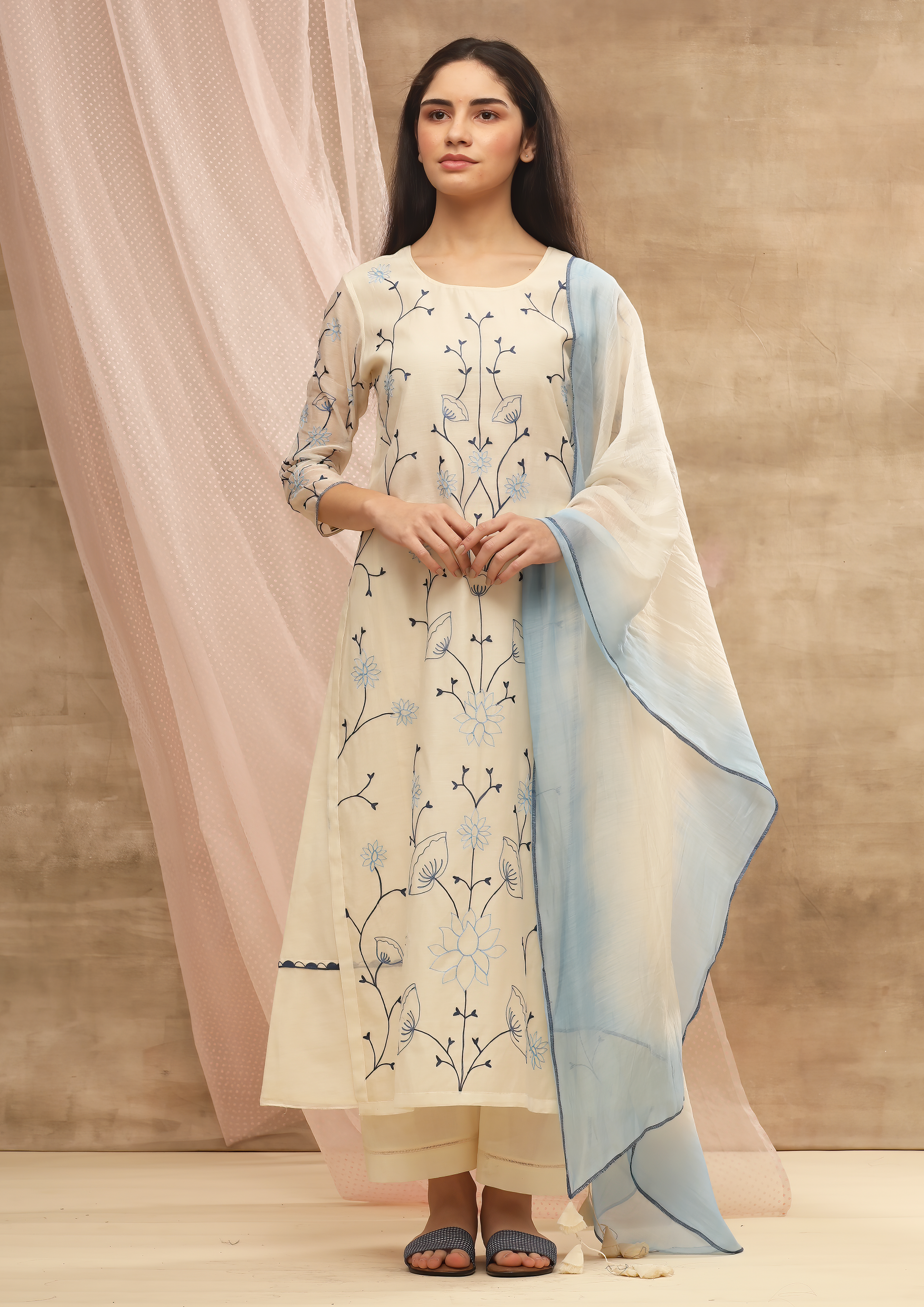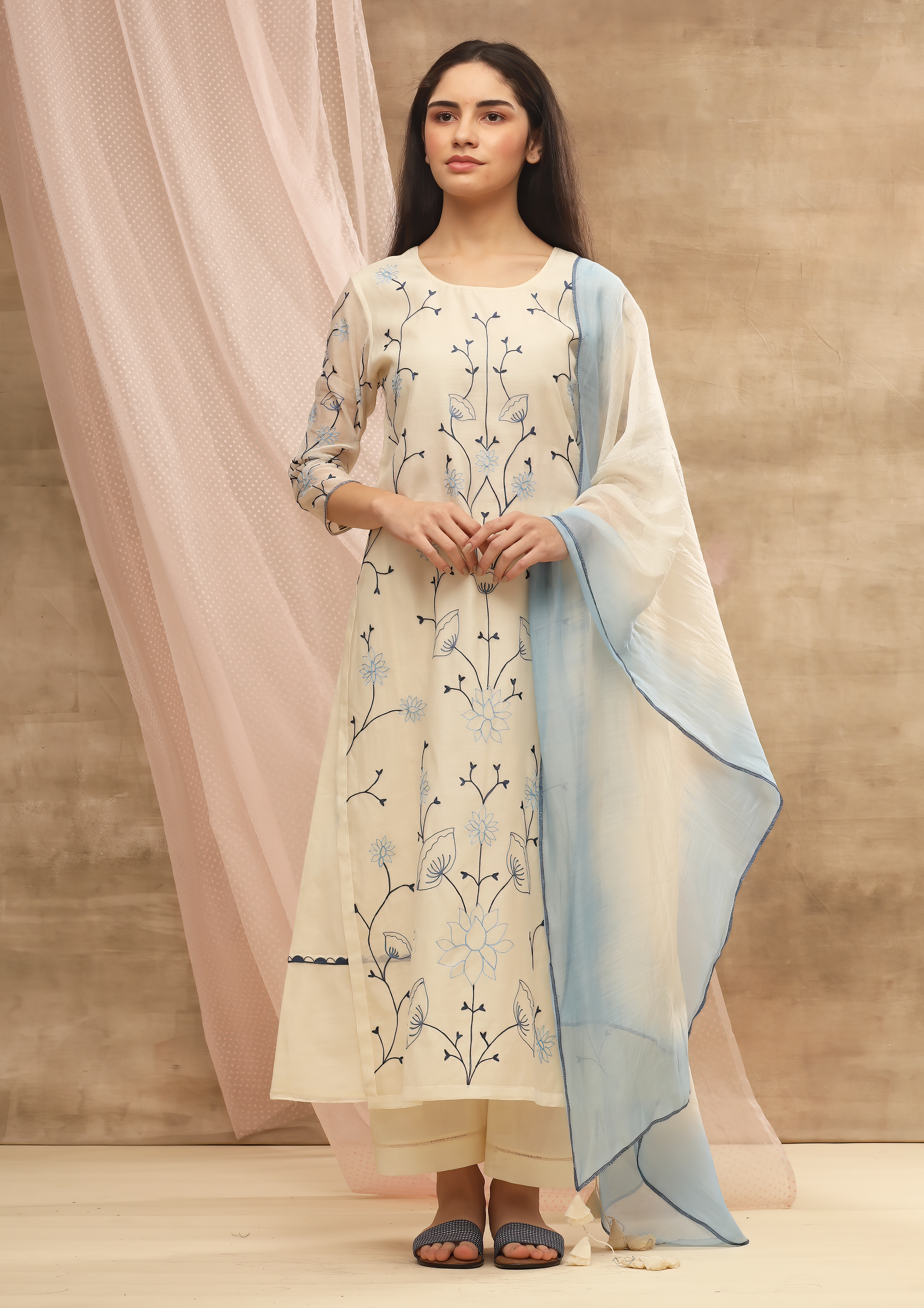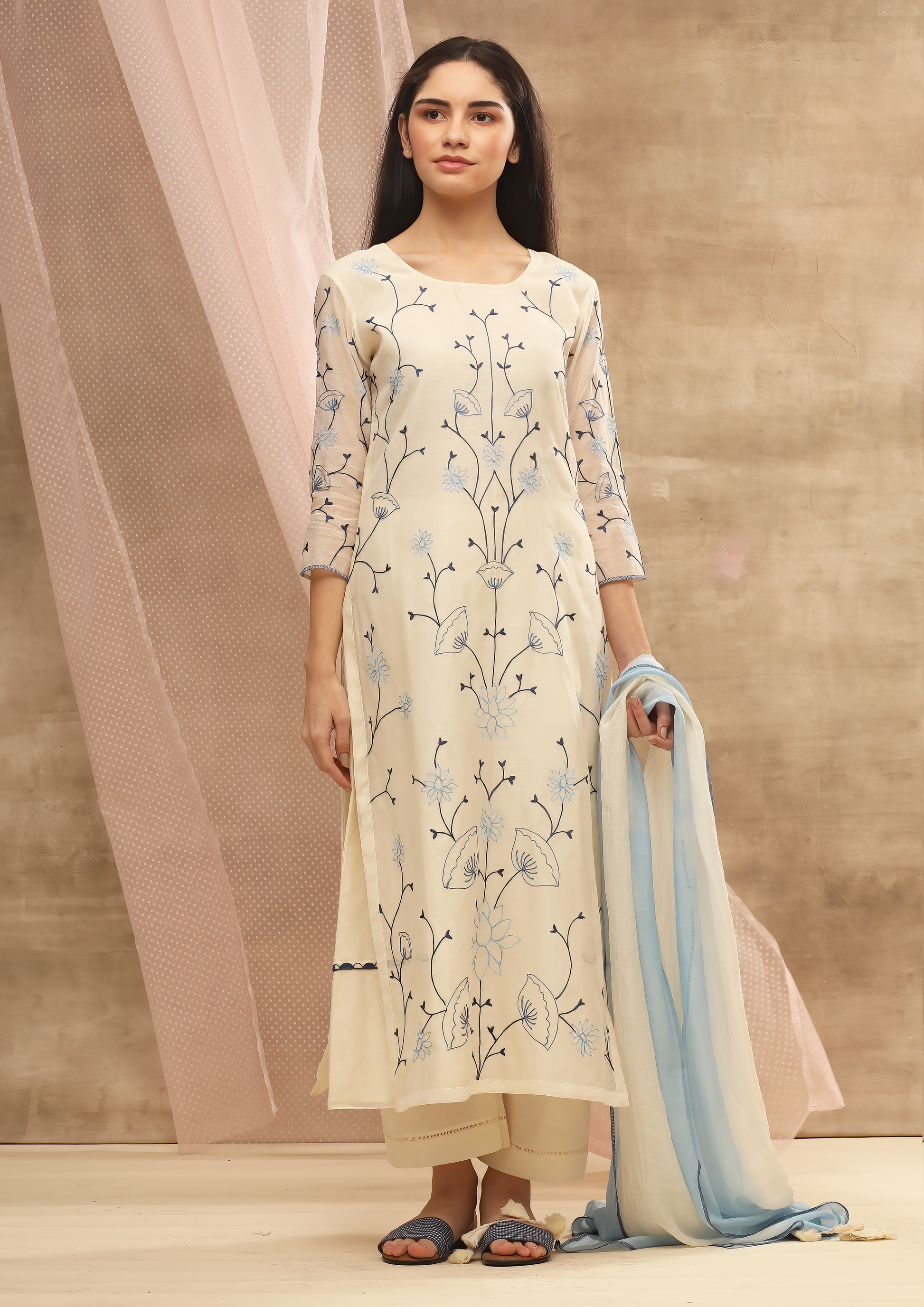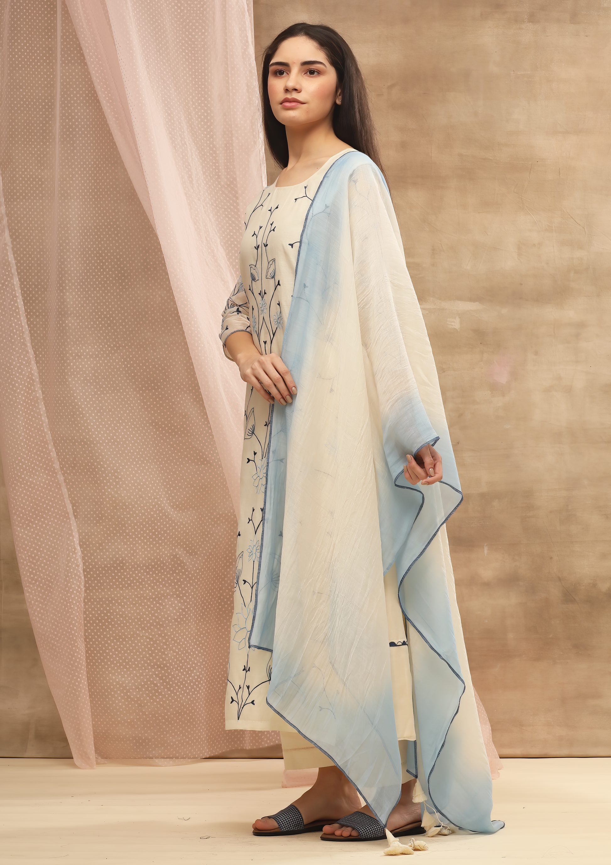 An ivory kurta with aari embroidery. It comes with a ombre dupatta.