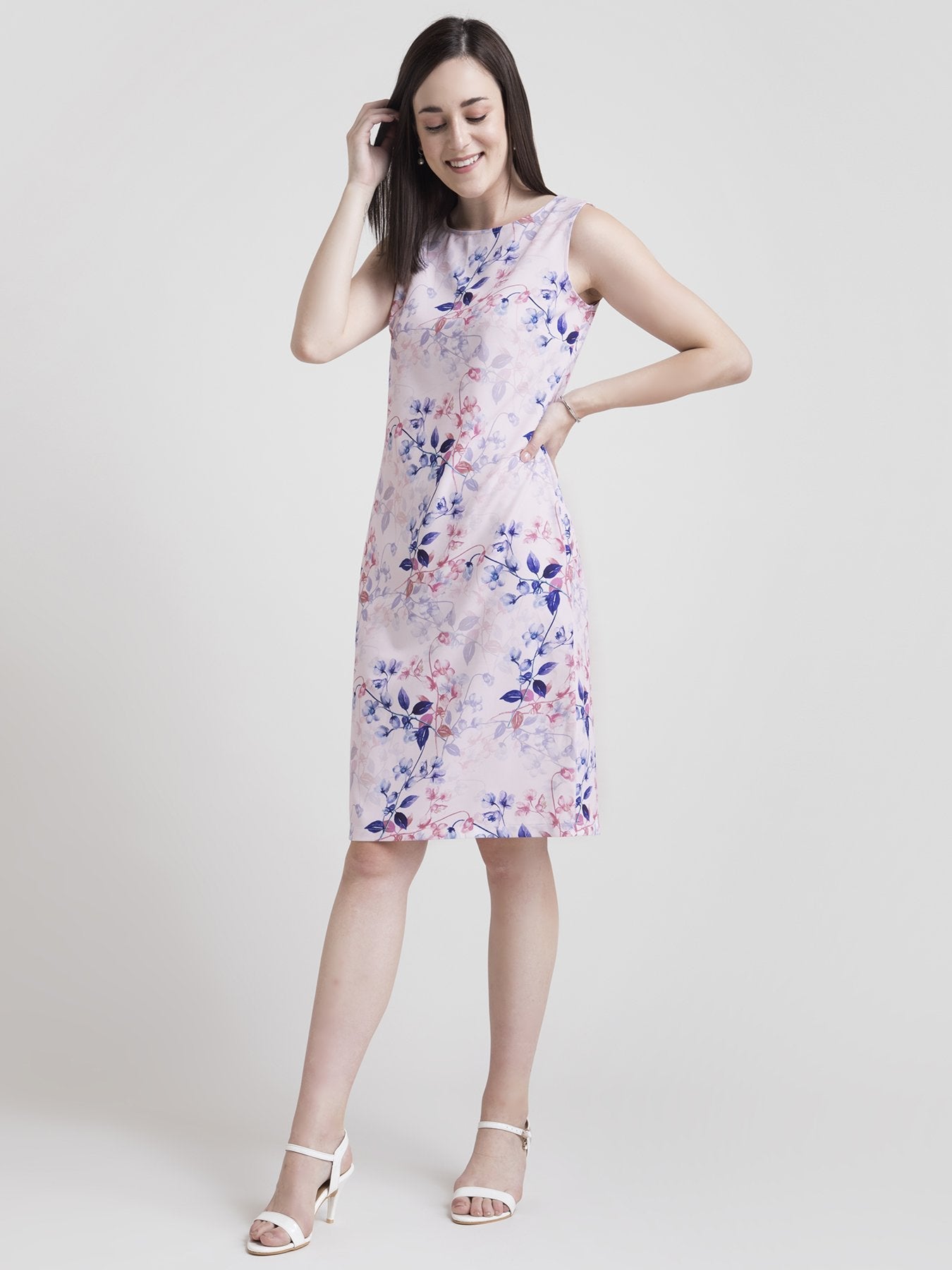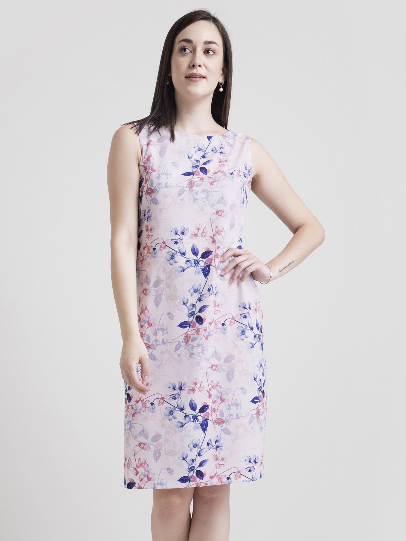 This pink and blue sheath dress has a boat neck, ditsy floral print and pocket. Made from Polyester Moss Lycra, it's soft, stretchable and anti-wrinkle.
