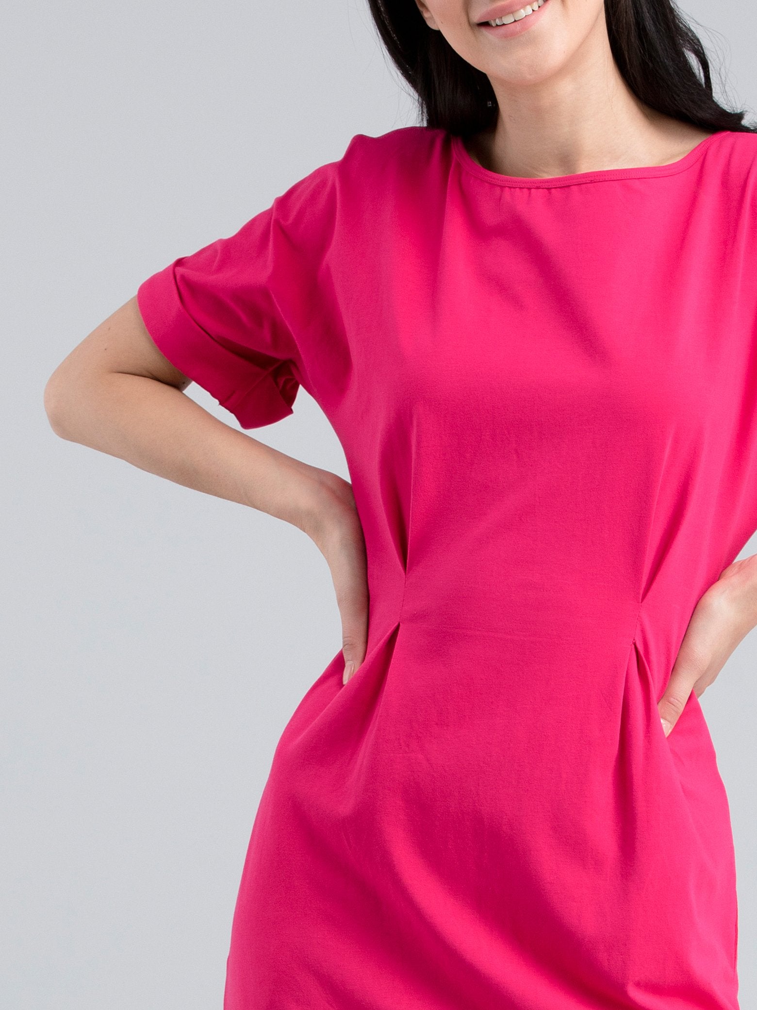 This pink, knitted, fit & flare dress has boat neck, drop shoulder, short sleeves with folds and doesn't take the shape of the body. Made from Hefty Lycra, it is stretchable, breathable, durable and comfortable.