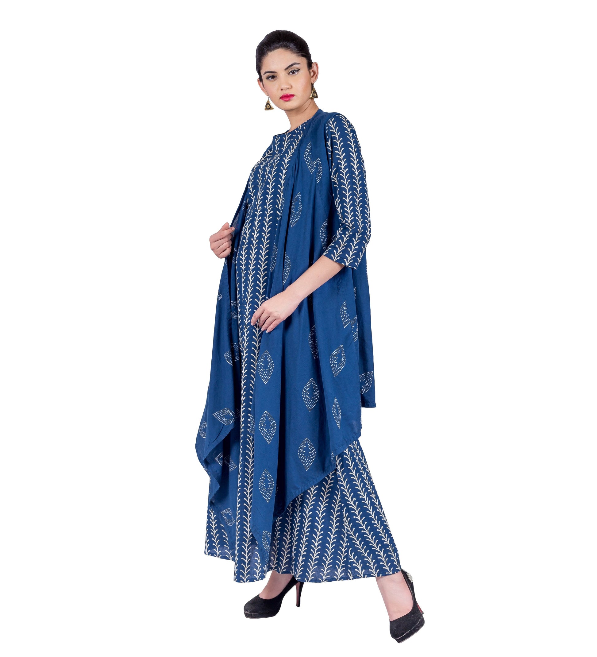 This ethnic revivalist fashion wear Boat neck flared A-Cut gown with hand block printed floor length waterfall shrug from the fashion house of . This delicate designing with experimentation of hand block printed palettes with this floor length gown style indo western dress is a supreme fashion wear. This vintage style boat neck flared gown is paired with the floor length waterfall shrug which is detachable and can be used separately too.