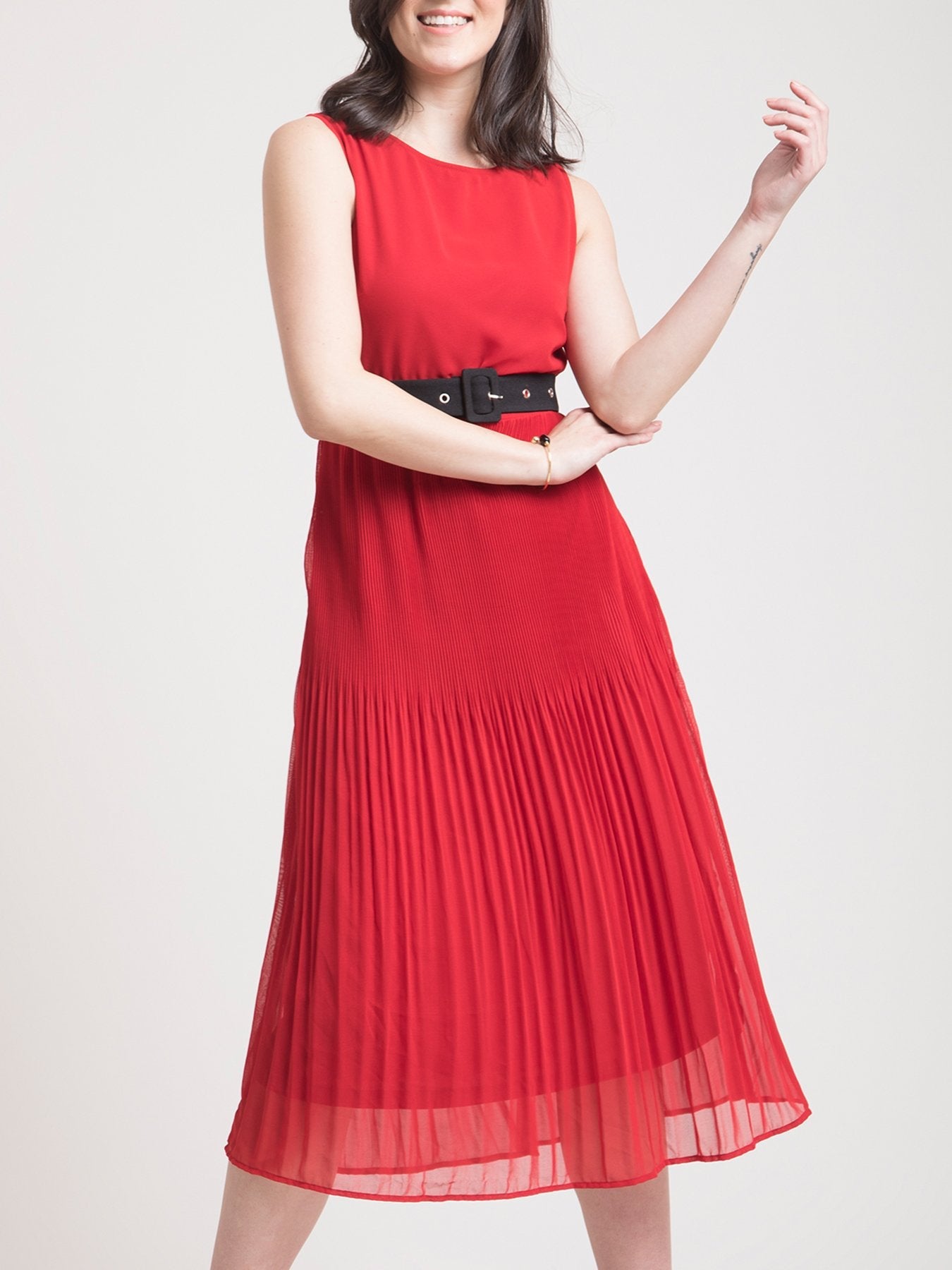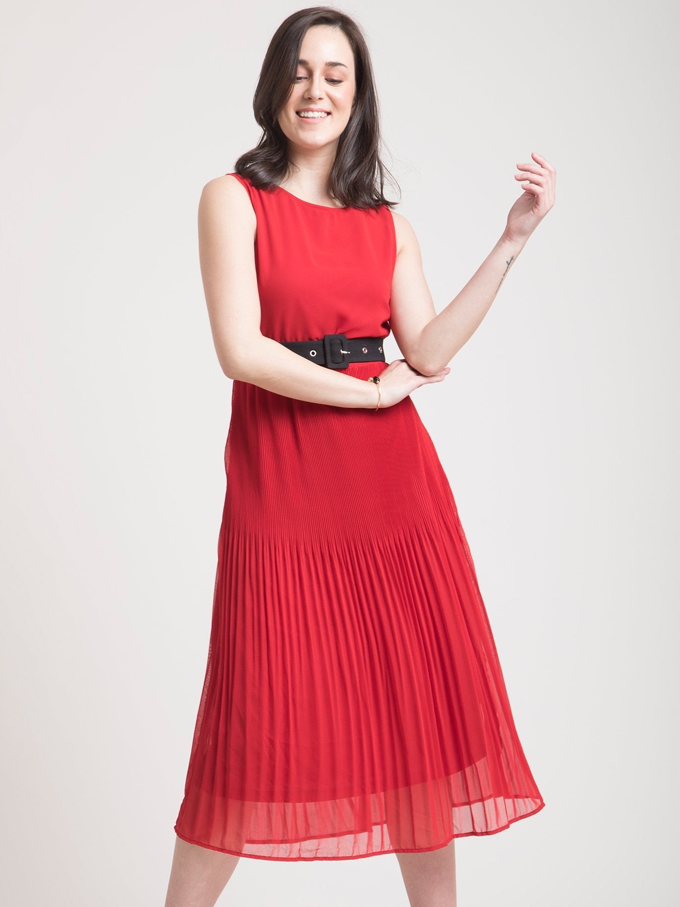 This red, A-line, midi dress has a boat neck, pleats, belt, concealed zip for closure and Polyester lining. Made from Georgette, it is soft and luxurious.