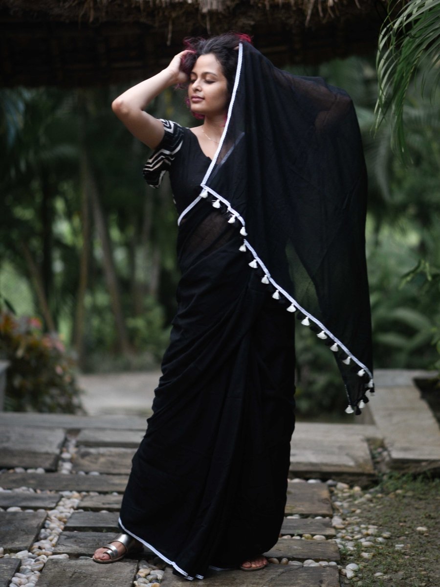 This utterly gorgeous black saree in made in heaven mul cotton with lace work is irresistible!