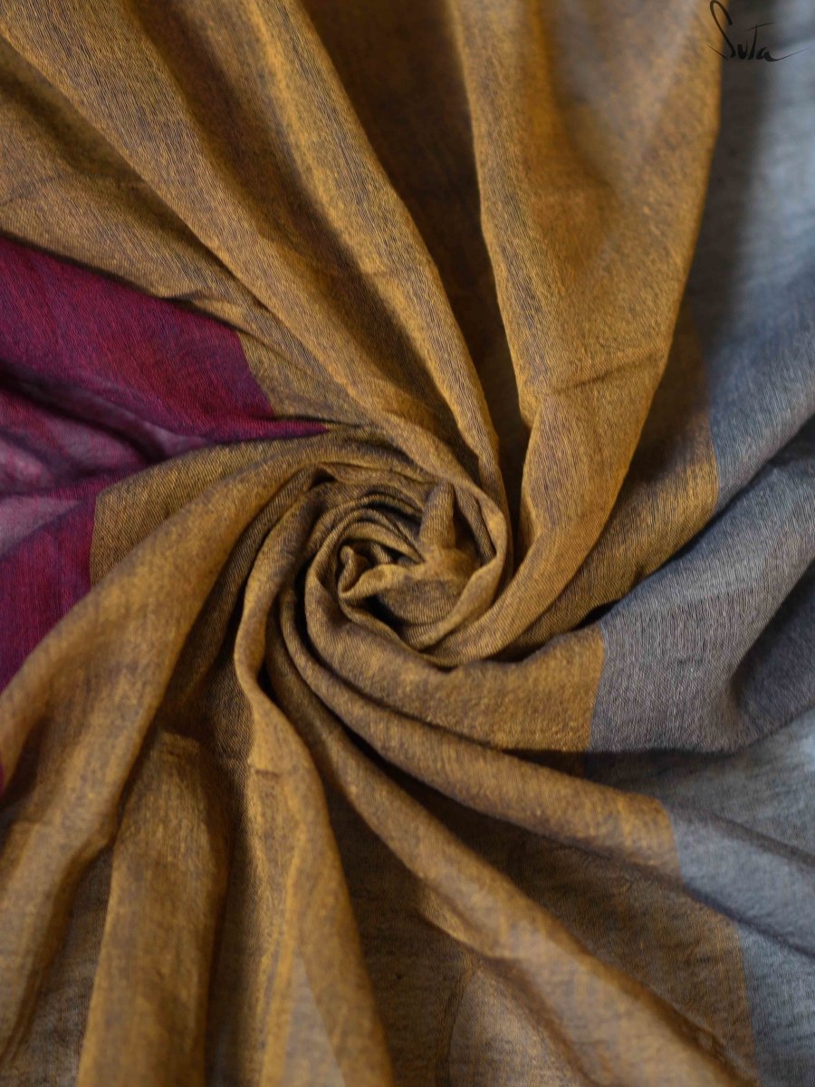 This uniquely beautiful grey, mustard and maroon made in heaven mul saree is truly a sight to behold!