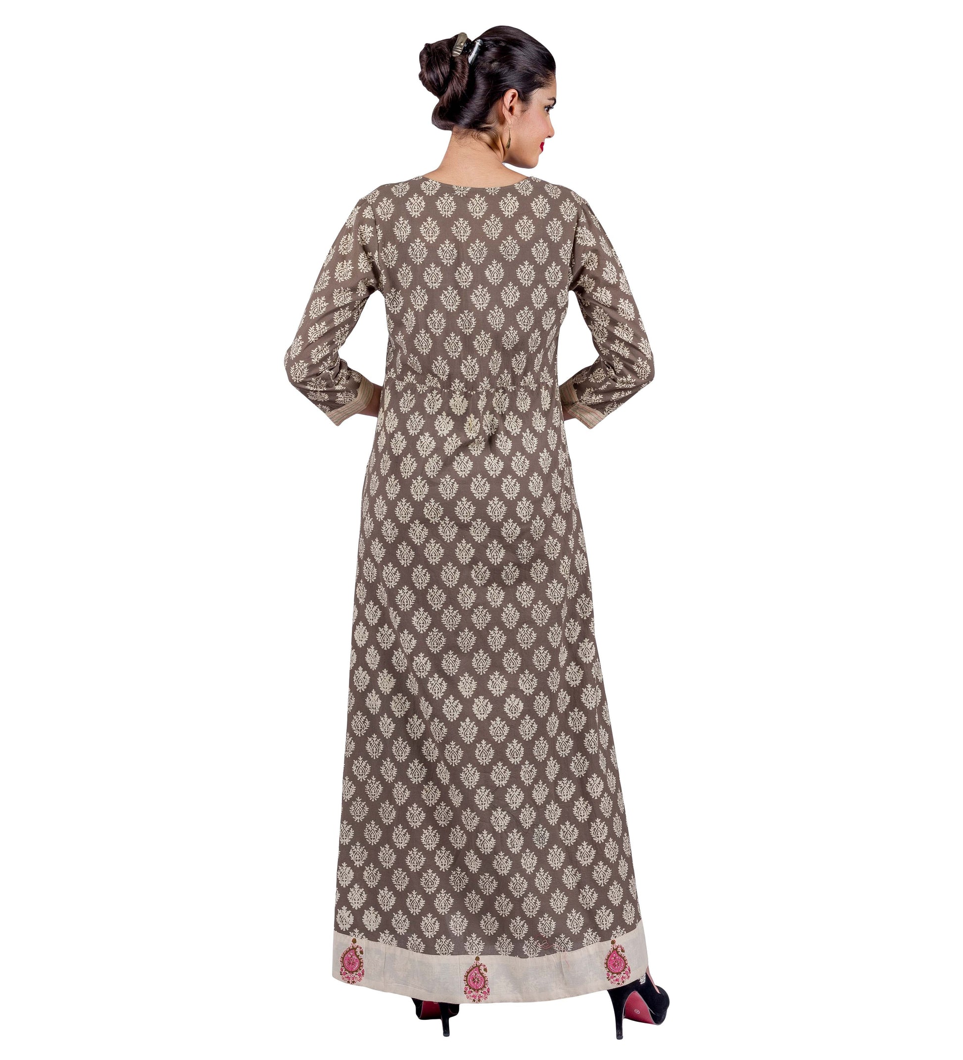 Showcase your feminism with this magnificent V-Neck Angrakha style princess cut floor length indo western flare dress from the fashion house of . This is a brilliant combination of grace and splendour. This v-neck princess cut indo western dress is beautifully clubbed with hem bordered neck, sleeves and bottom. This is a vintage style royal floor length gown which can be best seen in your night parties and breakfast brunches.