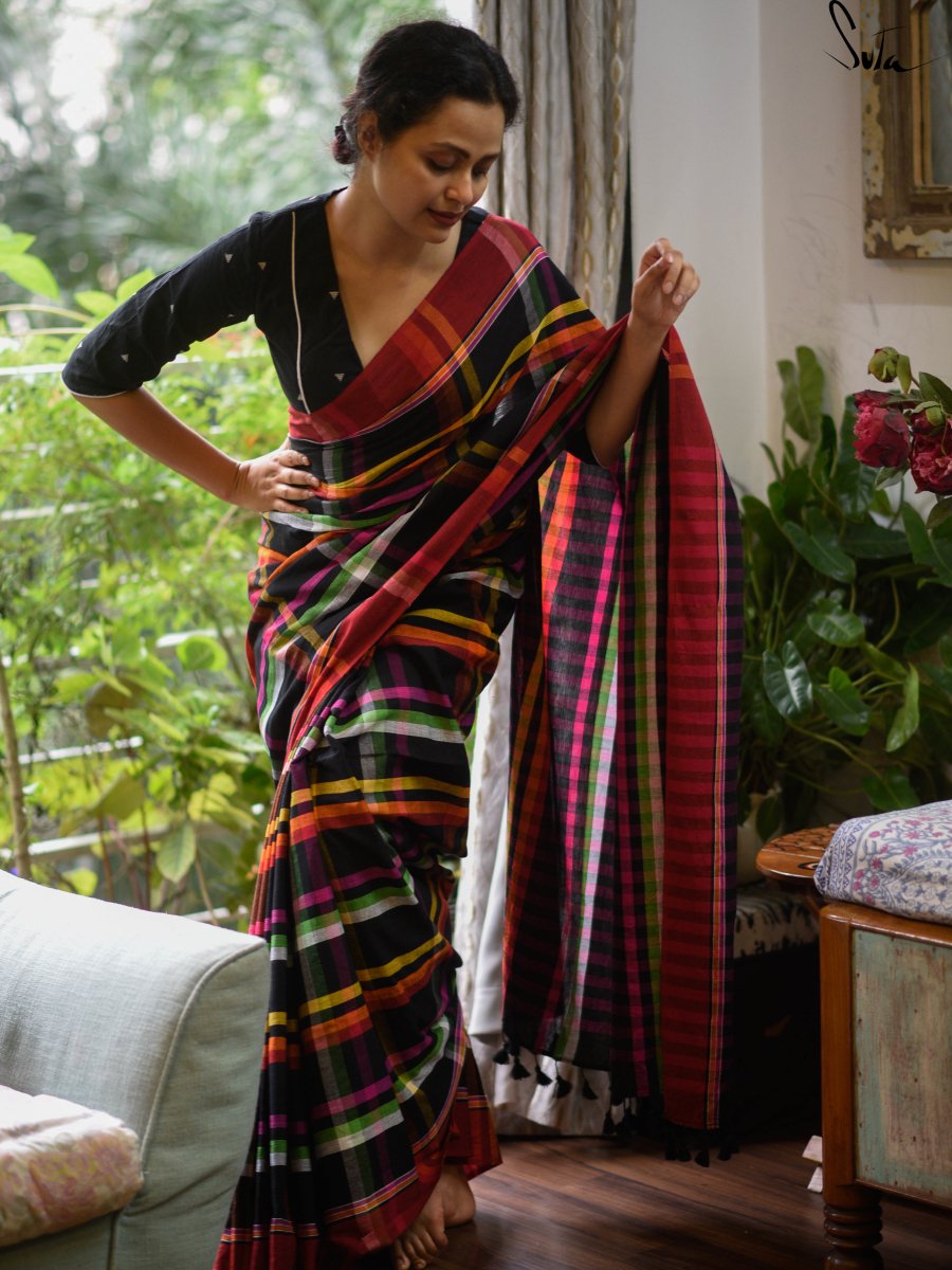 This gorgeous saree in black and multicolour hues is a dream come true!