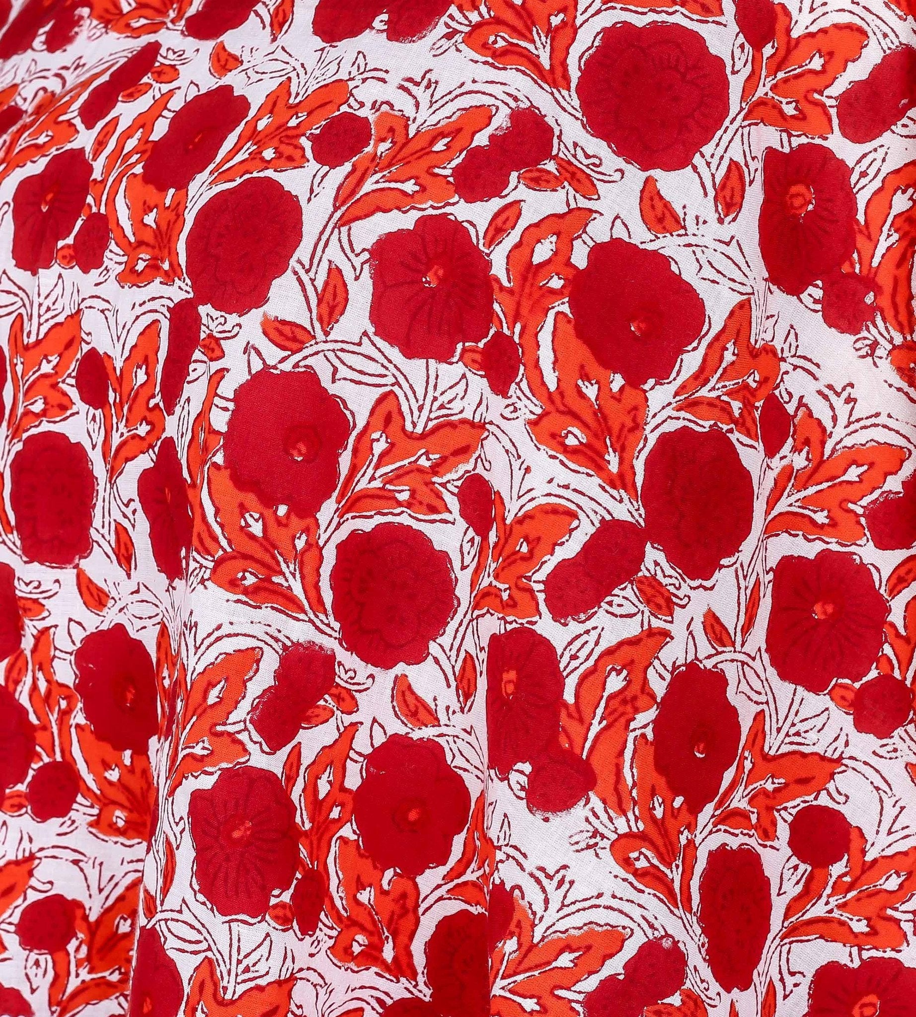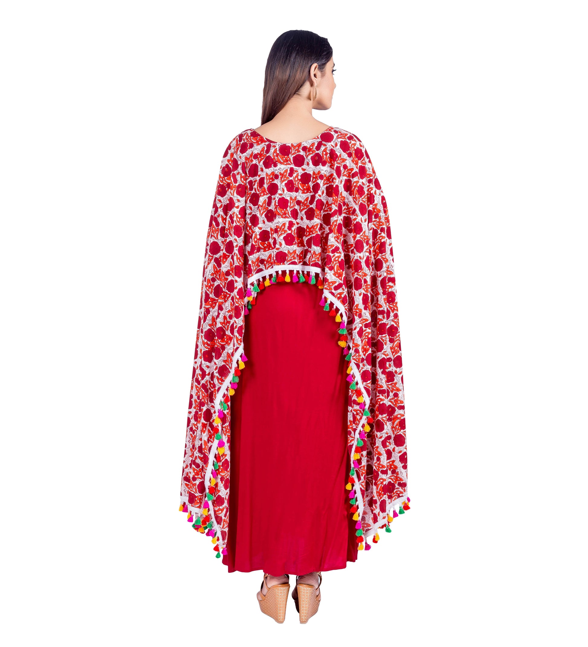 Strut with swag in this floral cape style modern indo western dress revitalizing your looks with fresh multiple color tassels on the cape, lined on delicate lace work that adds an attractive sense of detail and refinement. The dark tan floral designs and the red indo western dress tone create a relaxing feel to the rich color tones. Step into the weekend or summer delighted and calm. Be the ultimate fashionista with this dress sensation.