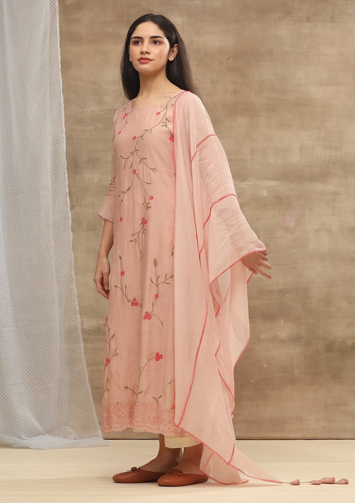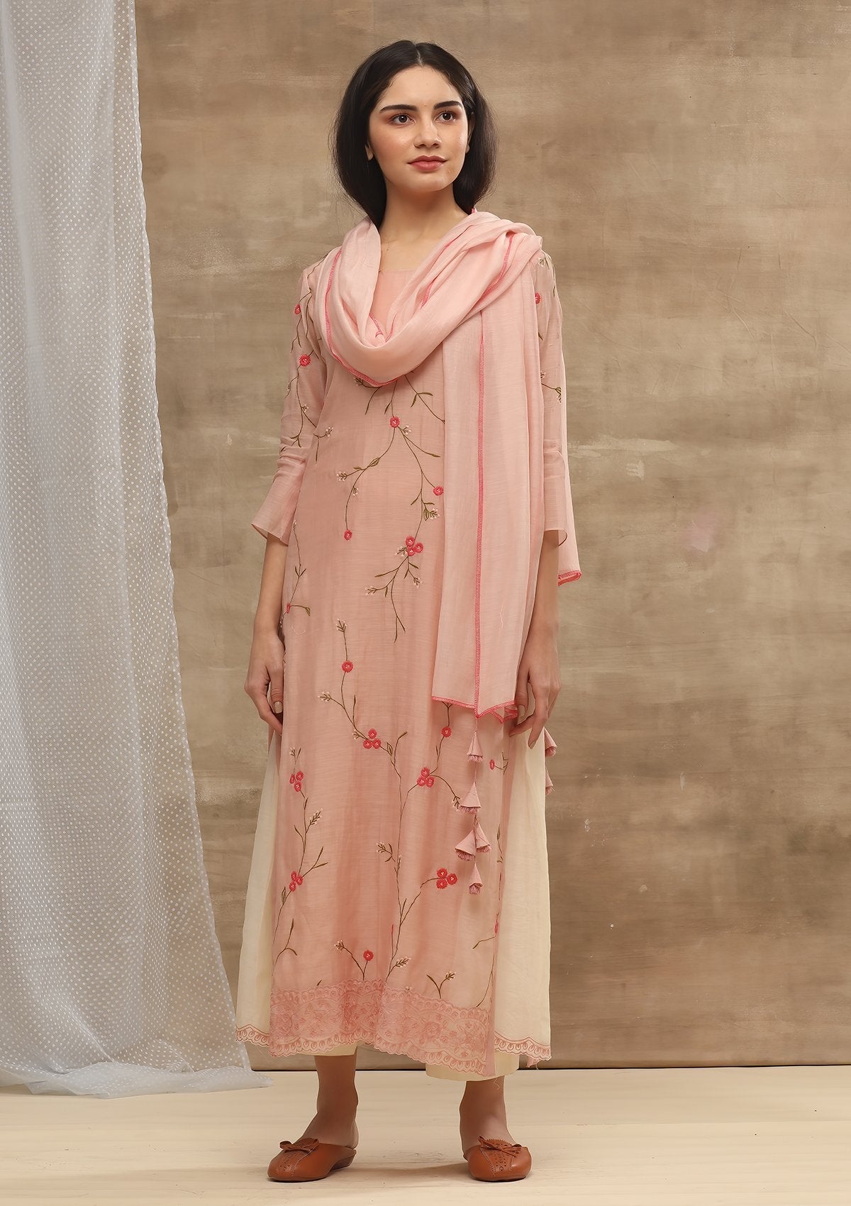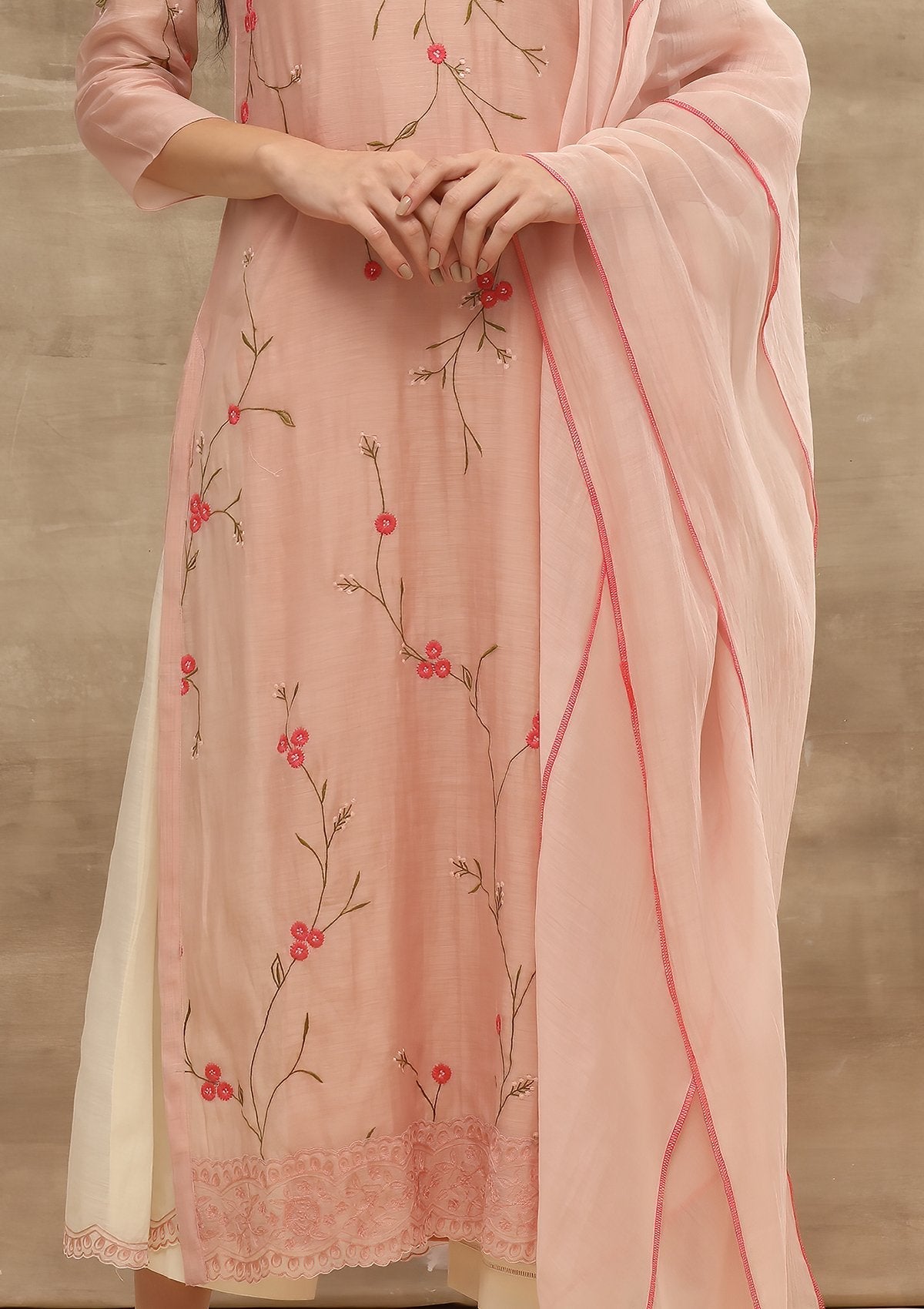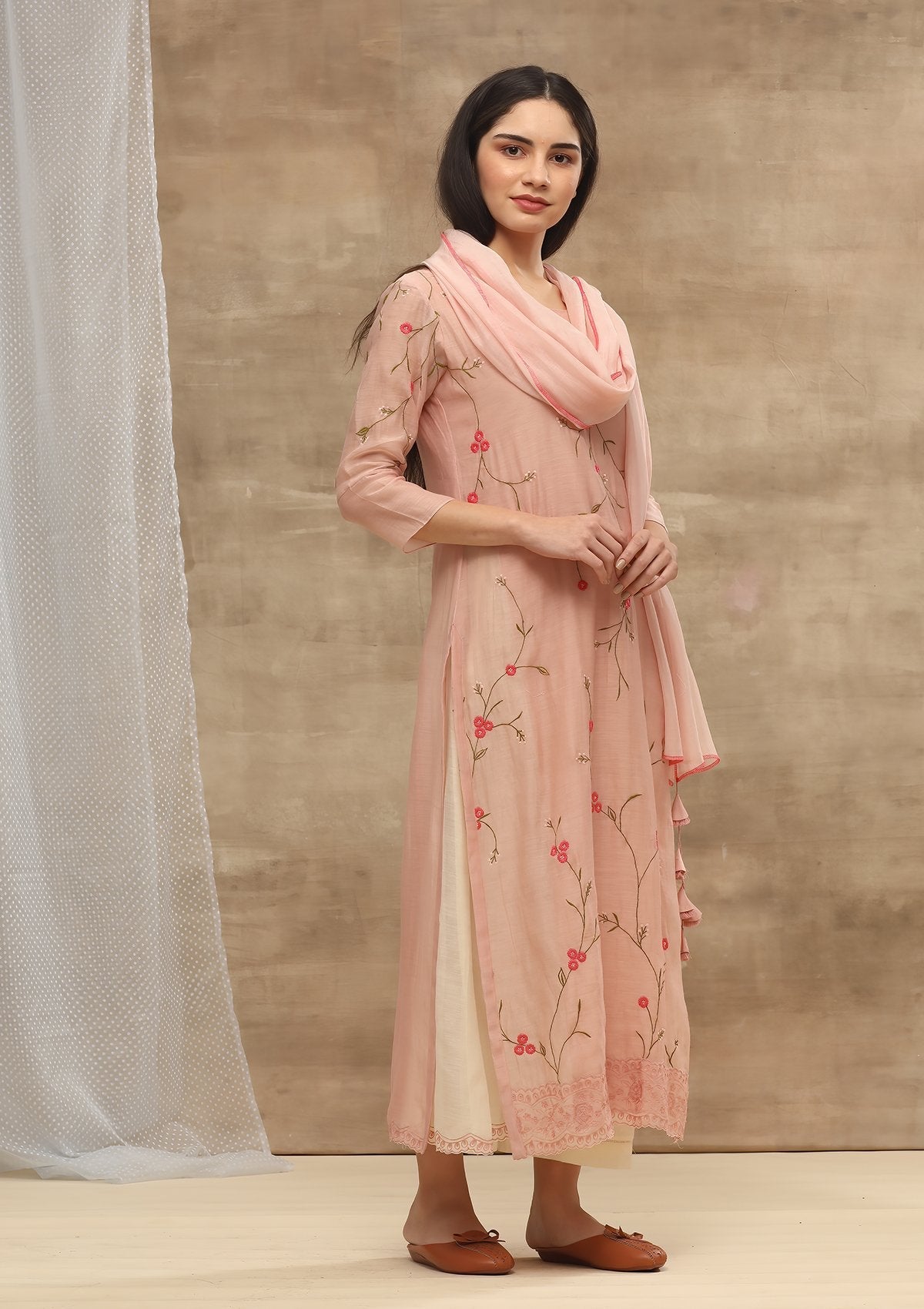 A blush pink cotton chanderi kurta with thread embroidery paired with a matching dupatta.