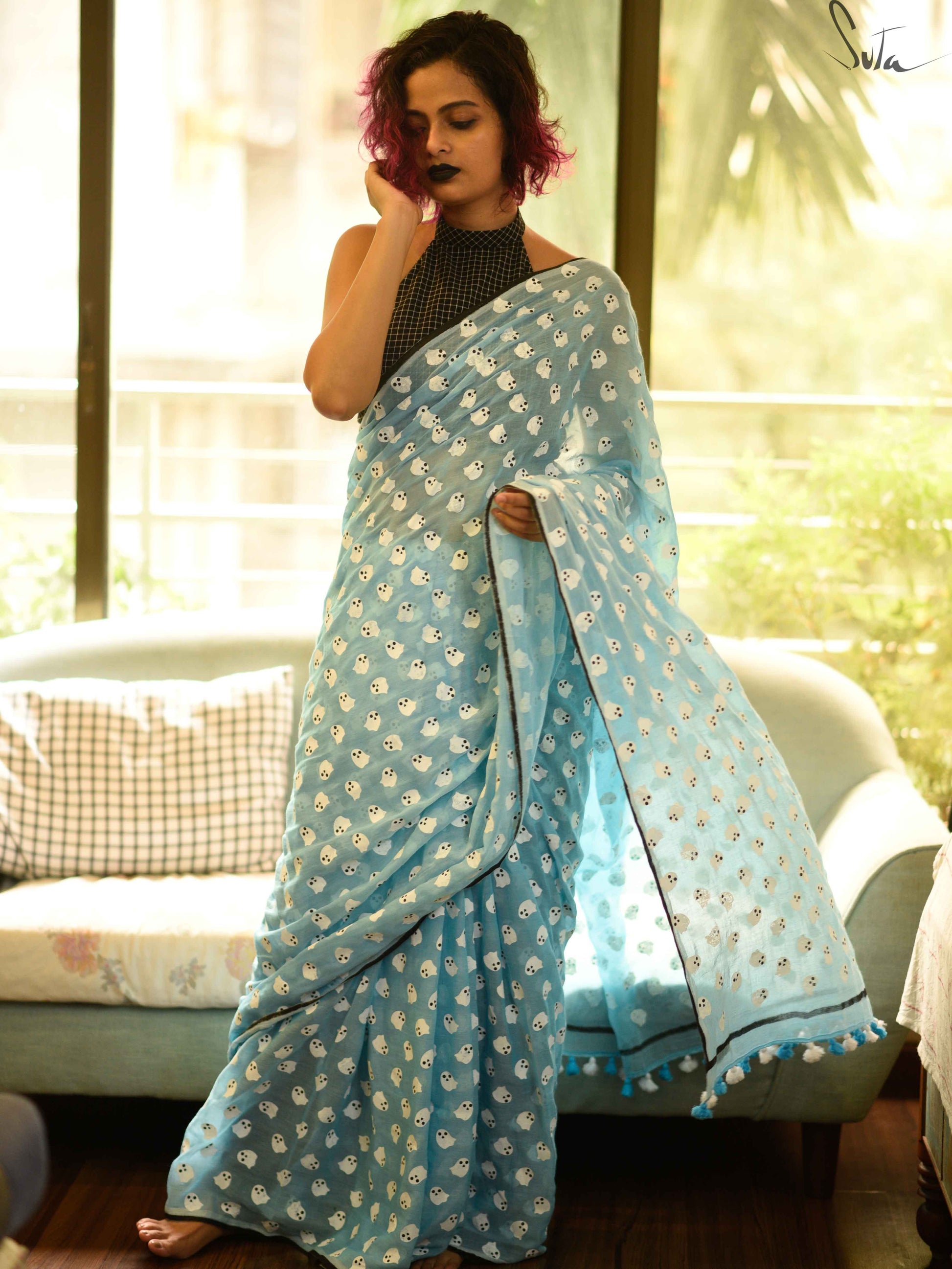 The block-printing on this saree is done on a made-in-heaven mul cotton fabric which is lighter than air and loved by our Suta Queens immensely.