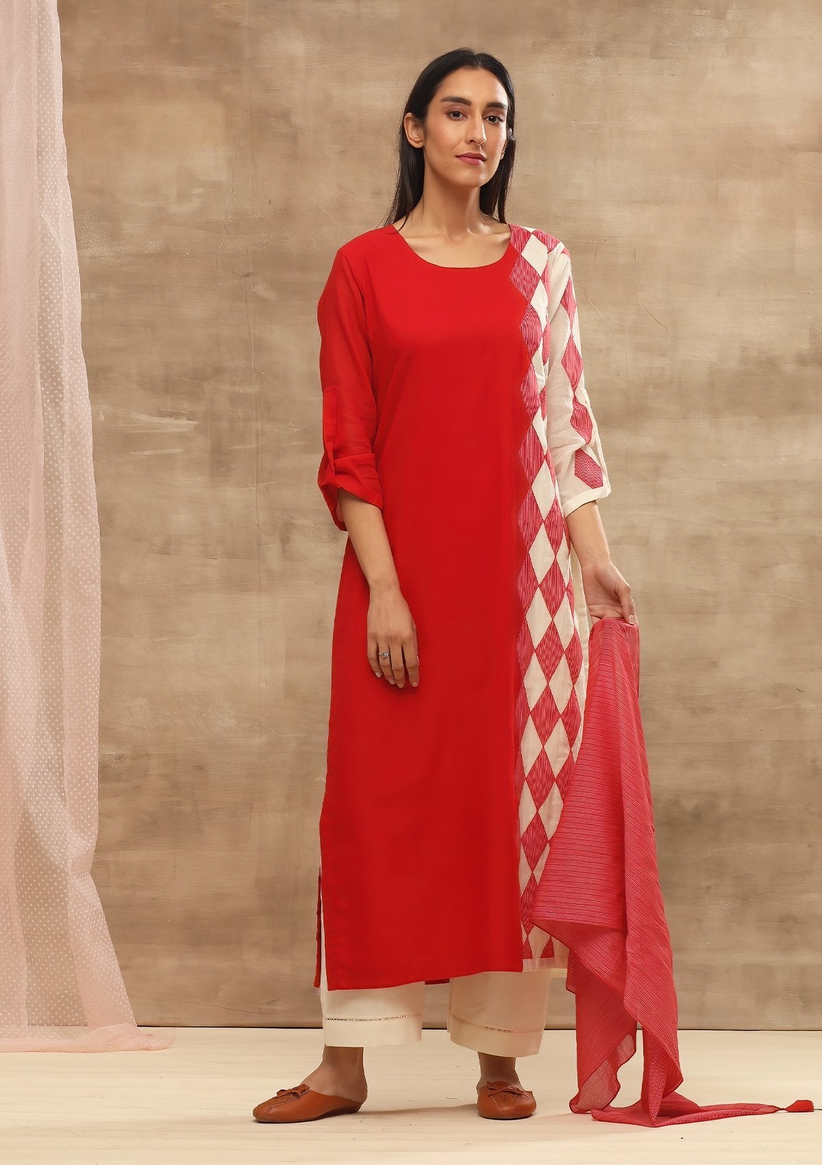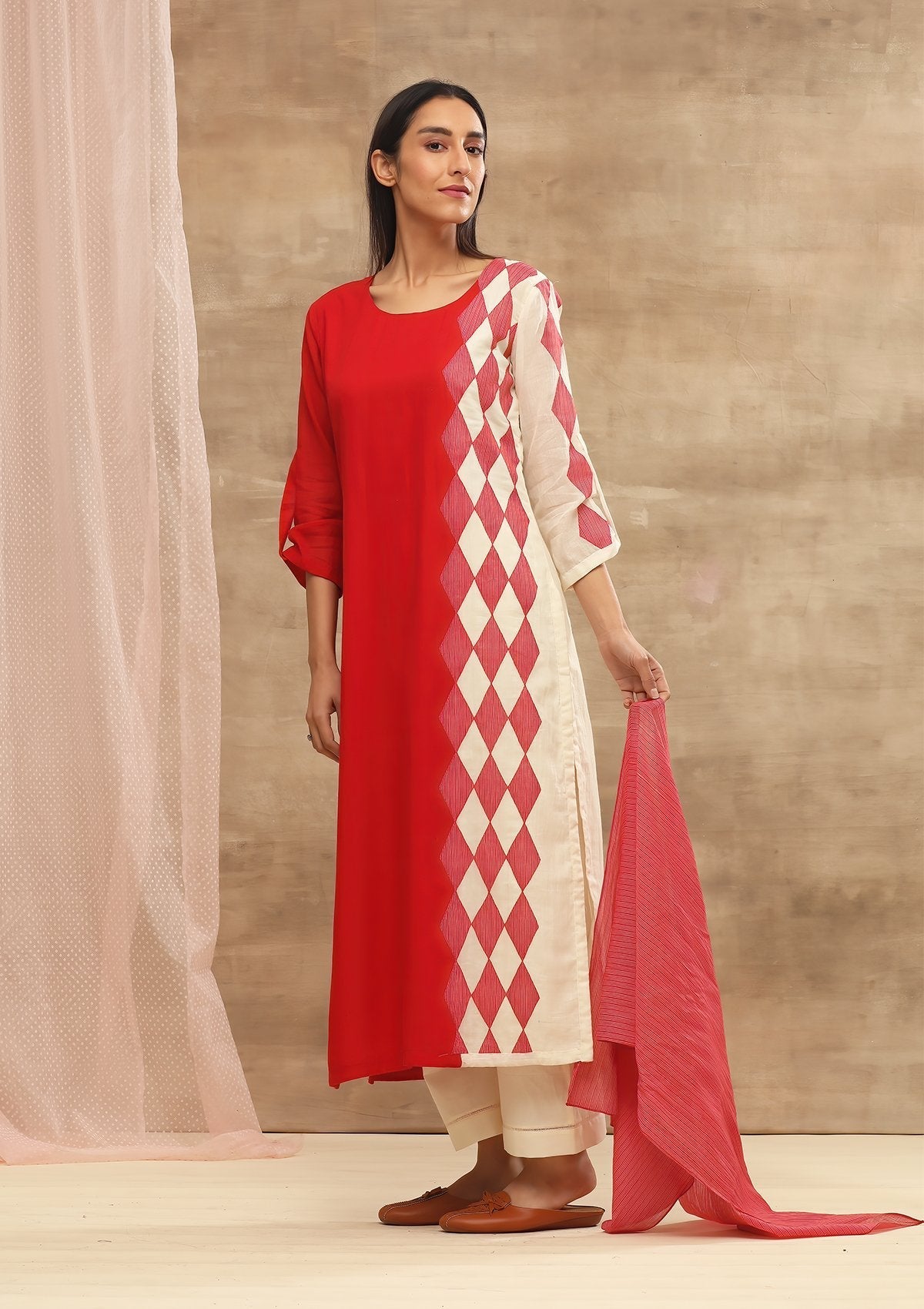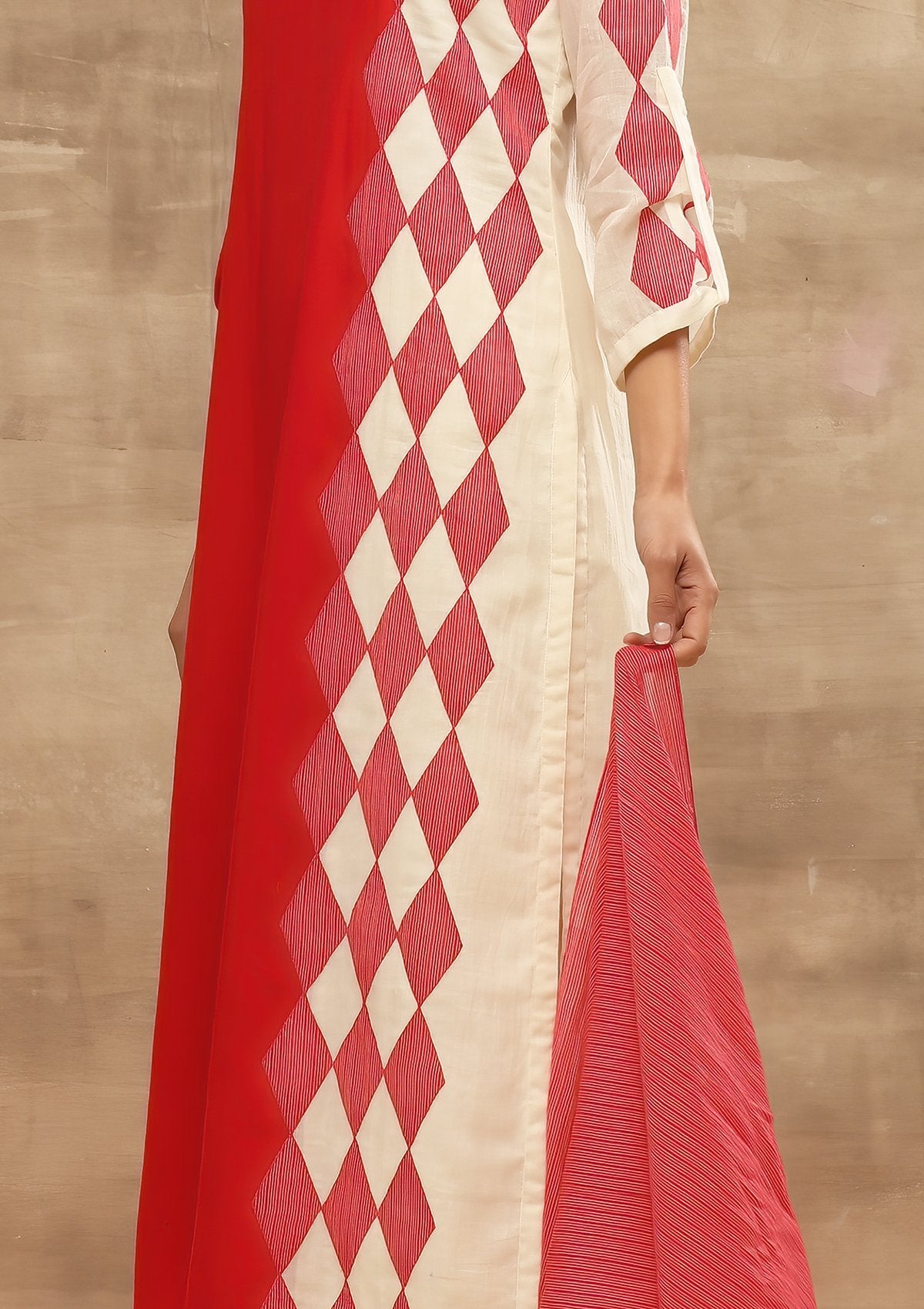 A handloom cotton kurta with woven stripe applique. It comes with a hand woven stripe stole.