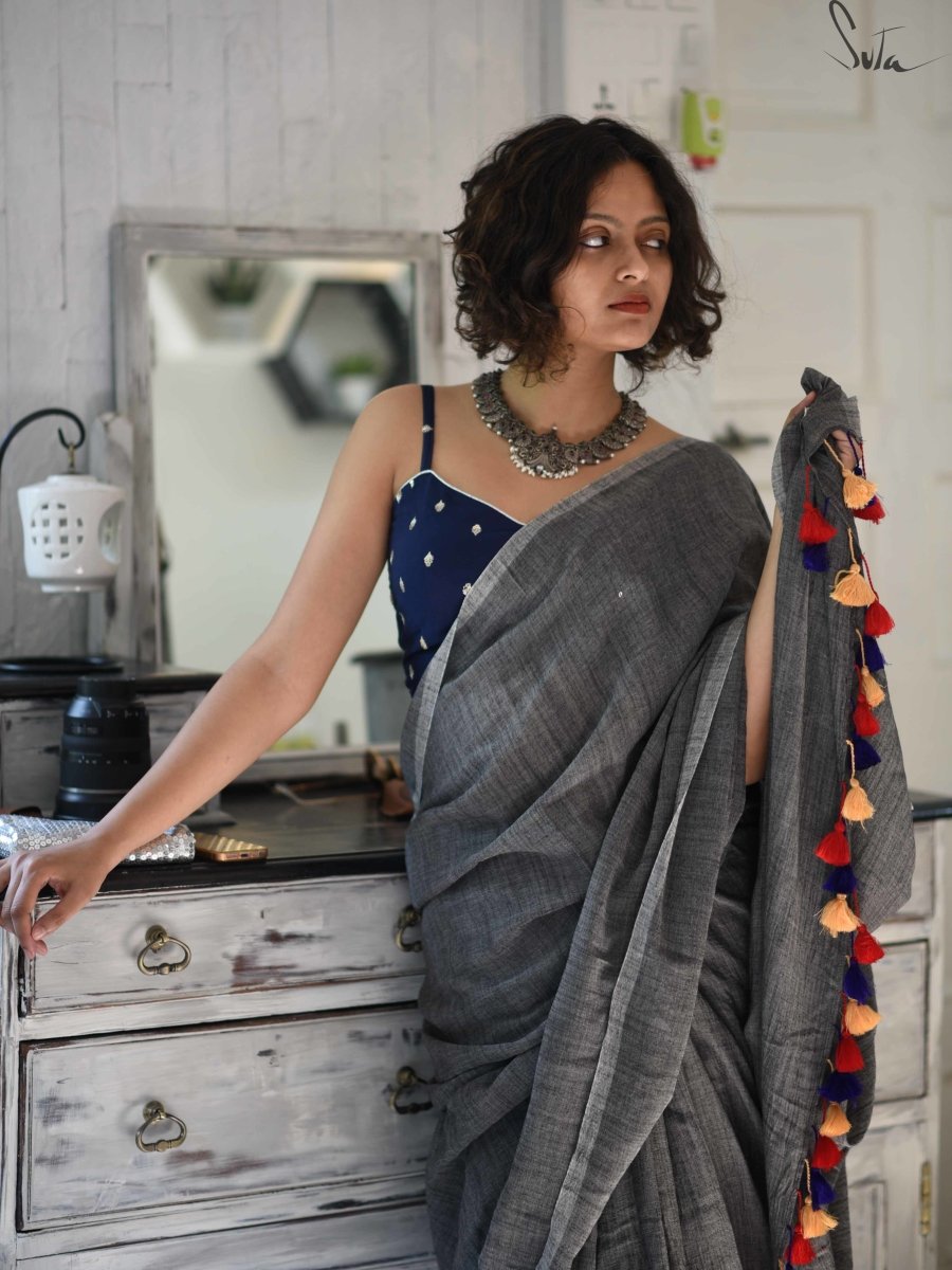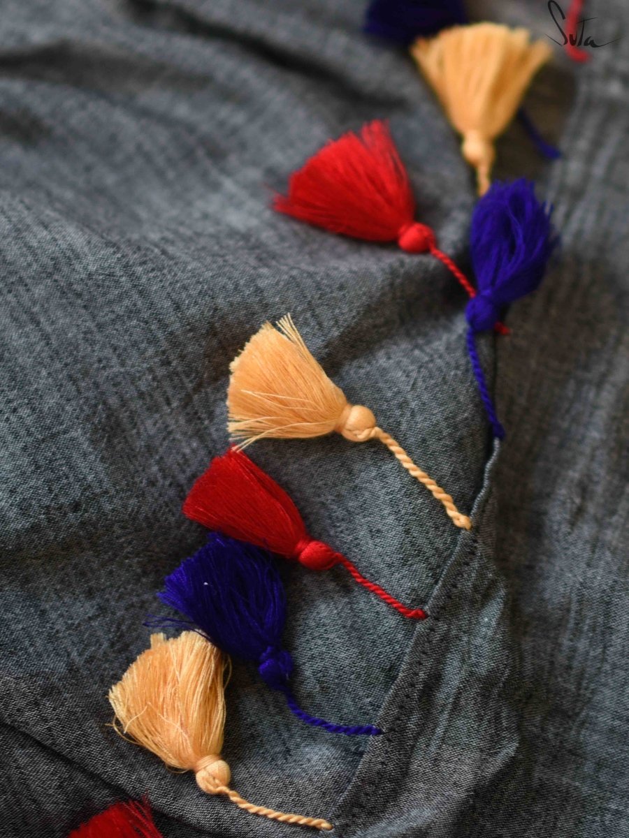 This absolutely arresting grey mul viscose saree is truly one of a kind. The tassels add the perfect pop of colour to steal your heart away!