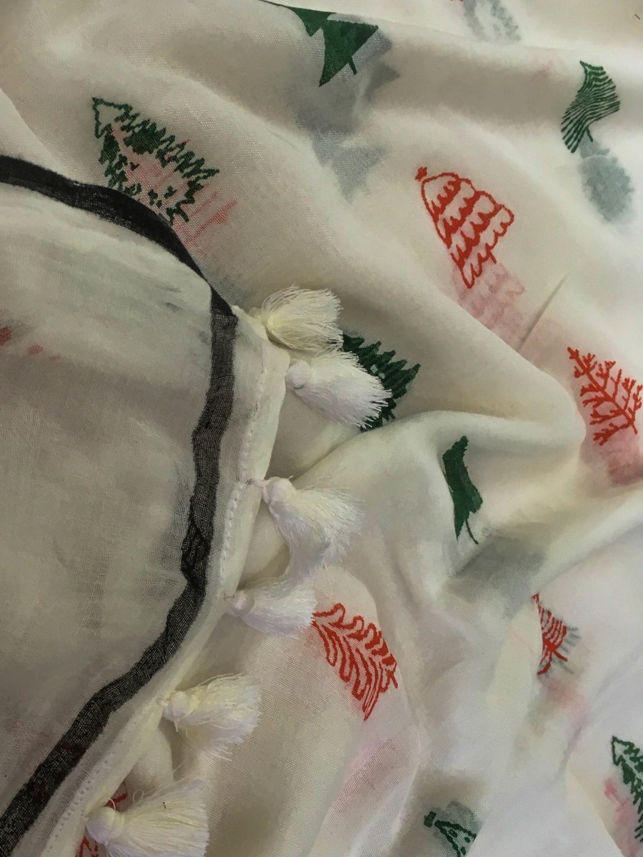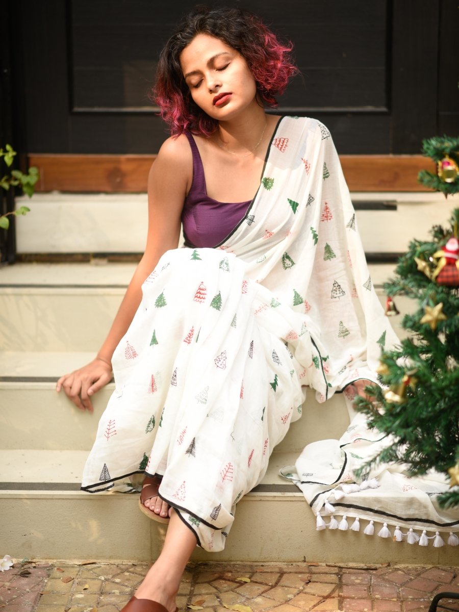 This Barfi made-in-heaven mul-modal saree with screen-printed details is dreamy! It has red and green detailing and is 5.5 metres long.