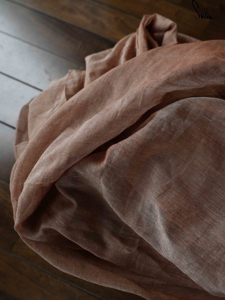 The mul cotton is what we call ‘Made in Heaven’ at Suta. Known in West Bengal as mul mul, the fabric is what can be categorised as muslin cotton. It is believed that this fine method of weaving cotton can be traced back to even before the Indus valley civilisation. What makes this fabric special is the almost magical process of weaving it. Cotton fibres are separated and spun into strong threads. The lightest and the most delicate fibres are separated and are then spun into muslin thread. These are then woven into fabrics by skilled weavers. The history of muslin weaving is a beautiful chapter in the history of Indian textiles. The process of the yore was much more complex and involved many unique tools that look primitive but worked like magic. The upper jaw of a catfish was used to initially clean the cotton before spinning. To separate the lightest fibres, a Dhunkar (a bamboo bow) was used, which when strung in a distinctive way made the lighter fibres rise above the heavier ones. This process gave the title ‘woven air’ to the muslin fabric. Weavers famously wove on looms that were at ground level and operated the looms from pits dug in the ground. Even during the Mughal era, the muslin fabric was seen as a symbol of power for its finesse. History is full of anecdotes to prove the awe that the muslin fabric generated. Emperor Aurangzeb is said to have chided his daughter Zeb-un-Nisa for appearing naked in the court when in reality she had been wearing several layers of the muslin cloth! Such was the fabric’s delicateness. The almost invisible fabric had made an Arab traveller in the 10th century remark that the degree of fineness is such that a garment can be drawn through a ring of a middling size. During the British colonisation and even during the Mughal rule, the art of weaving muslin took a hit as weavers were treated poorly and drought hit many of the weaving centres. As a result, today, the process of weaving has seen a lot of change. Nevertheless, the essence of it hasn’t changed and the charm of the fabric still remains.