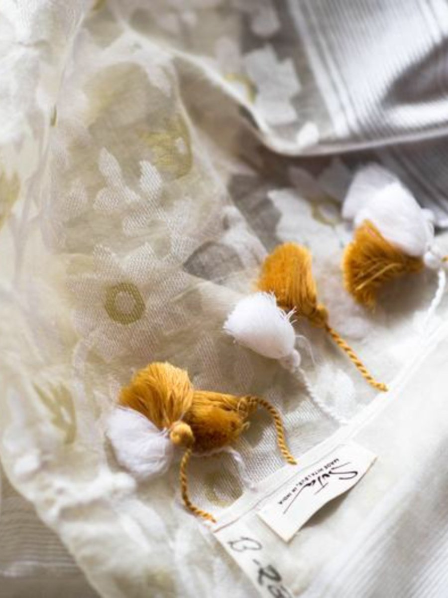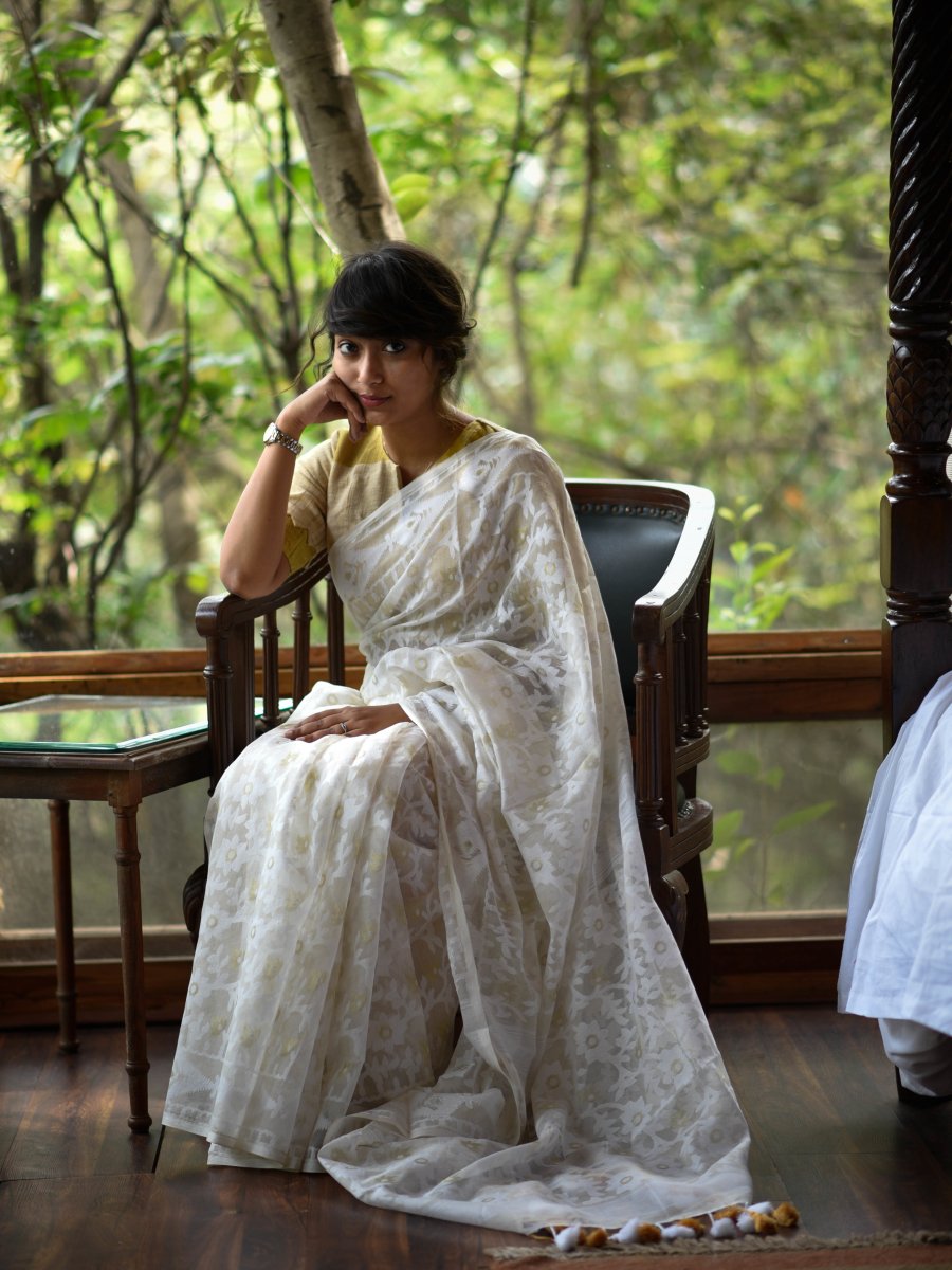 This saree is made of a gorgeous fabric that is a blend of cotton and polyester, hand-woven on a Jacquard handloom. Here, a set of punch-cards are attached to handlooms to sort the weaving patterns. This makes it easier and faster for weavers to weave the fabric to life. The saree is fluid, soft, falls amazingly well and embodies the charms of handloom fabrics.