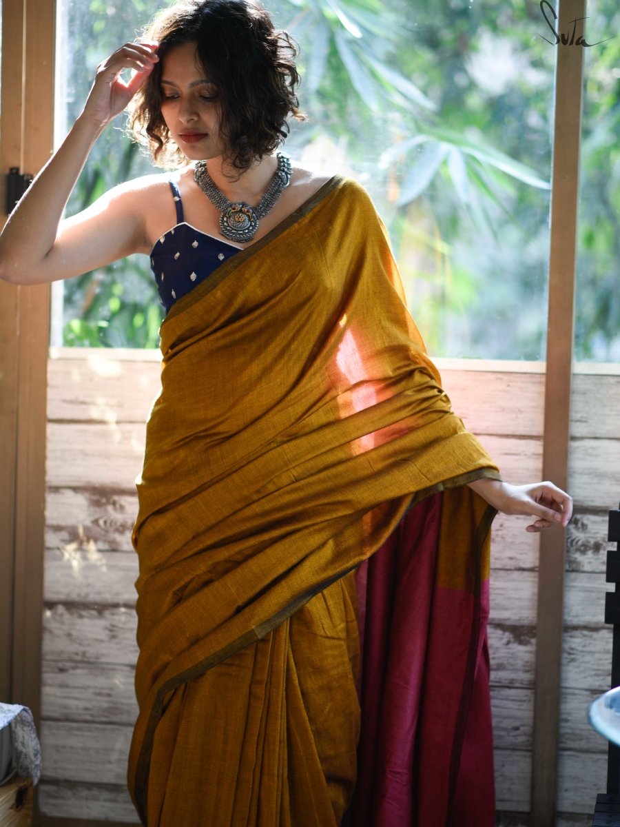 Cotton fabric dates back to some of the most ancient civilisations and it has a strong presence in the modern wardrobe as well. The softness and lightness of cotton combined with its strength and versatility makes it one of the most popular choices, especially for the Indian climate. We took this simple, elegant fabric and combined it with acrylic for that added sheen and voila! We love what we see and the saree falls so beautifully that it feels like second-skin!On the whole, this blend of fabric is 70% cotton, 30% acrylic and 100% amazing!