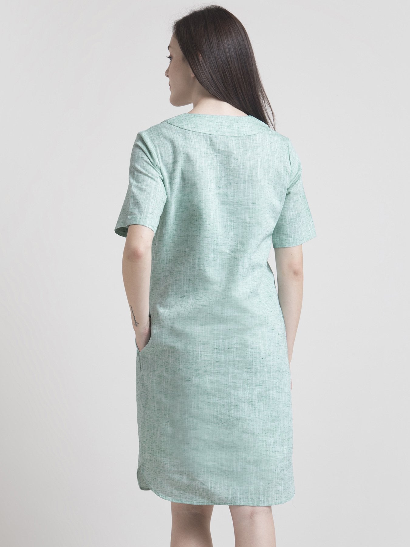 This green straight dress has a V neck, short sleeves and pocket. Made from Cotton Melange, it is comfortable and breathable.
