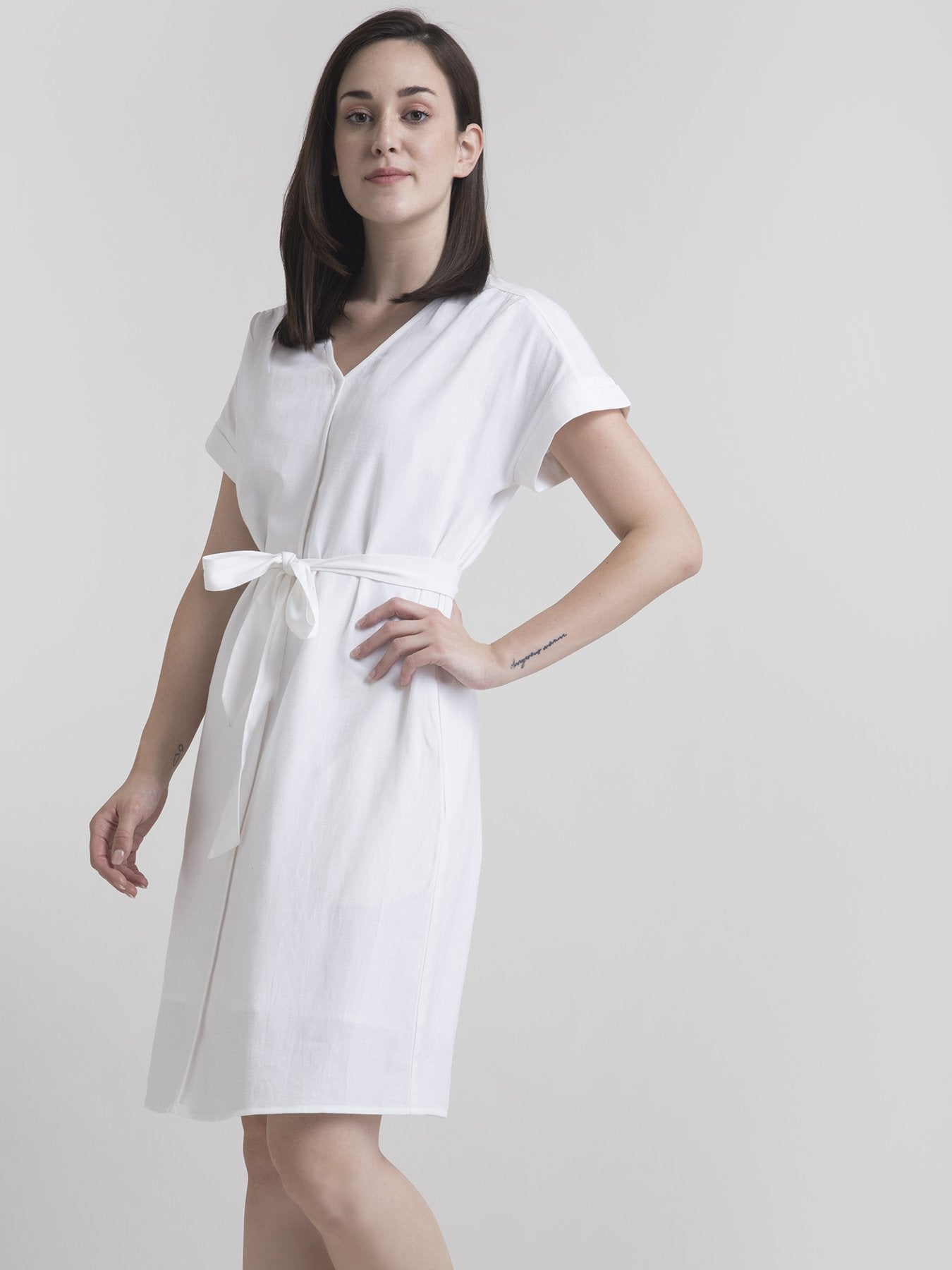 This white shift dress has a V neck, drop shoulder, pockets, tie-up and Cotton slip. Made from Cotton Flax, it is comfortable and breathable.