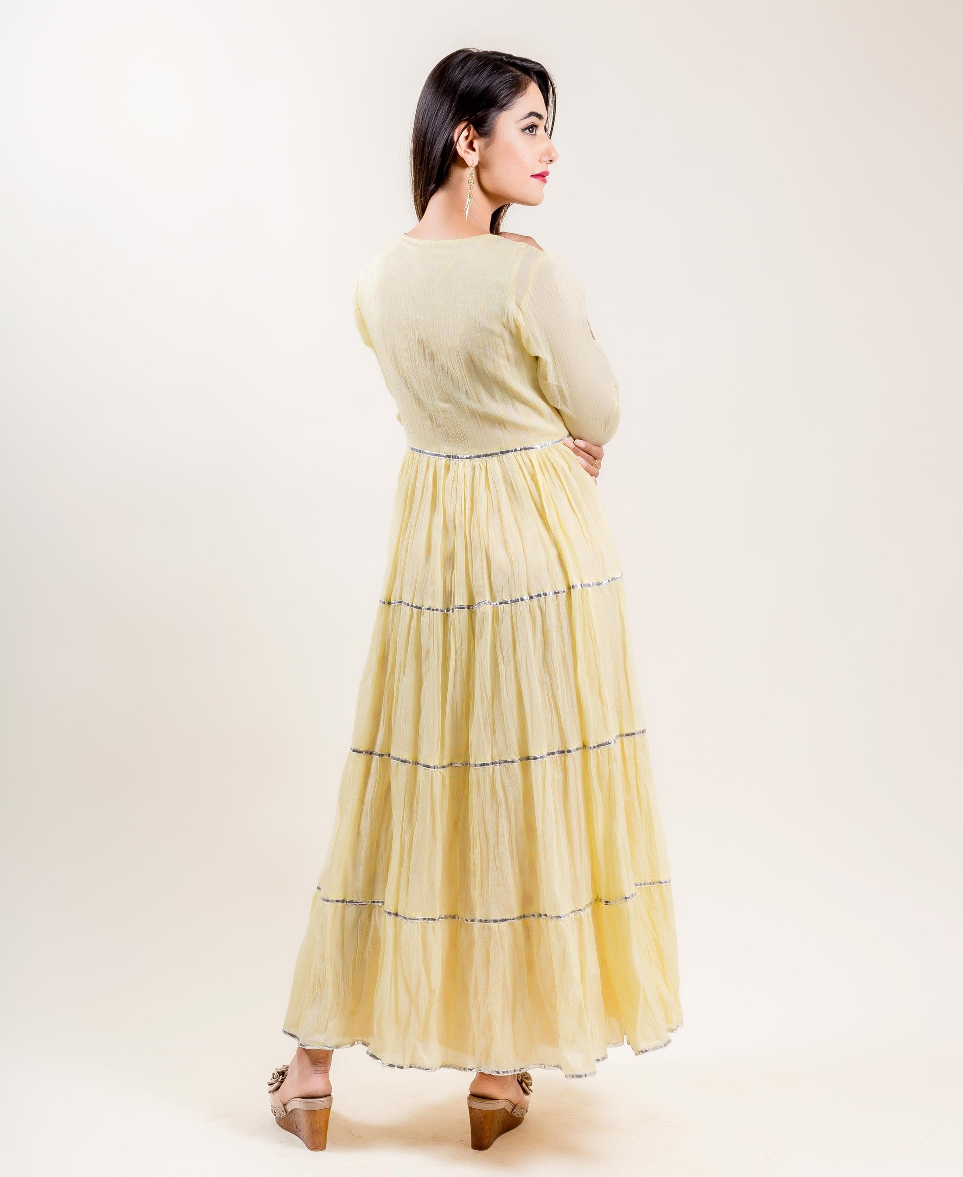 Delight your senses in this extremely stunning long tiered dress in lemon hue. Part of exclusive collection, this dress flaunts beautiful hand block prints paired with matching lemon tiered silver gota trimmed upper wear. With quarter sleeves and round neckline, this fancy dress has a fair share of femininity and has a charming cut above anything else.