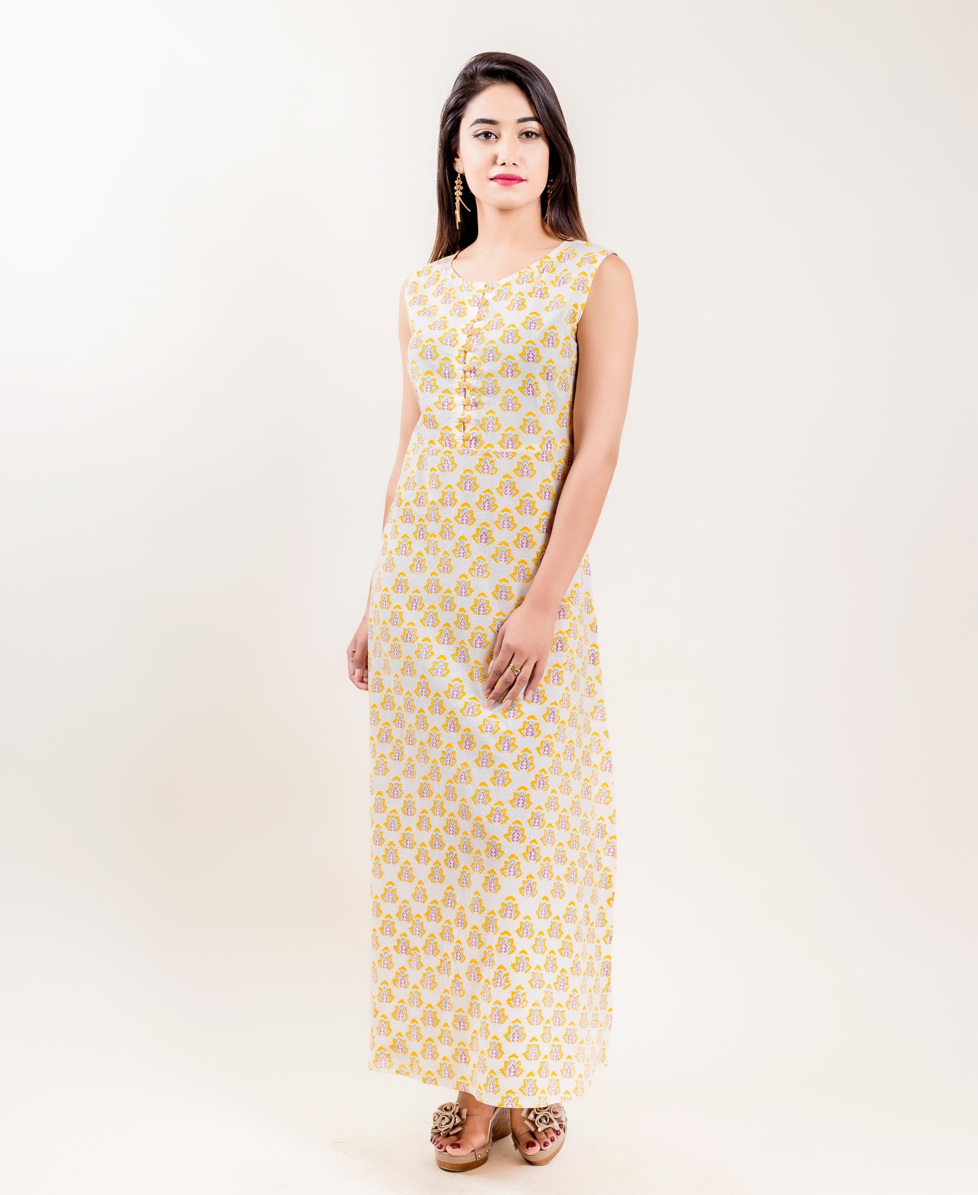 - Inner: White sleeveless cotton hand block printed inner
