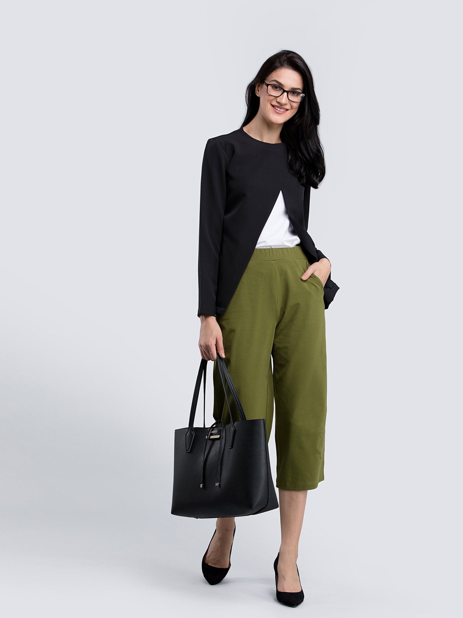 These olive, knitted, mid-rise, slip-on culottes have pockets. Made from Cotton Lycra, these are breathable, comfortable and stretchable.