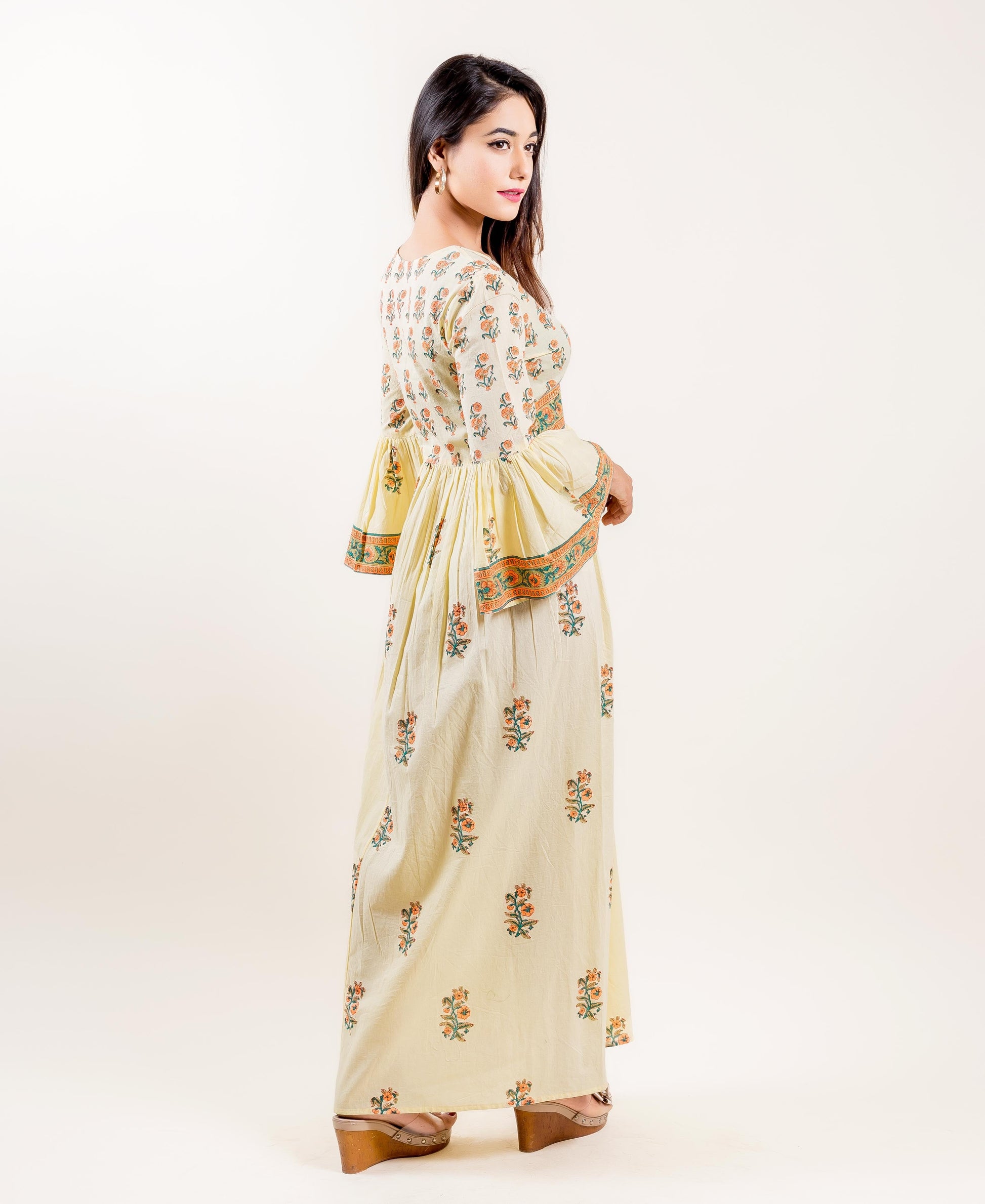 A contemporary styled ensemble does not require much to look gorgeous and this cotton printed long dress is one such ensemble. Designed from cotton fabric, this has a combination of prints, bell sleeves; round neckline and front slit styling designed to toss on and impress everyone instantly. Nothing short of sheer elegance, this dress would make you look gorgeous to the next level.