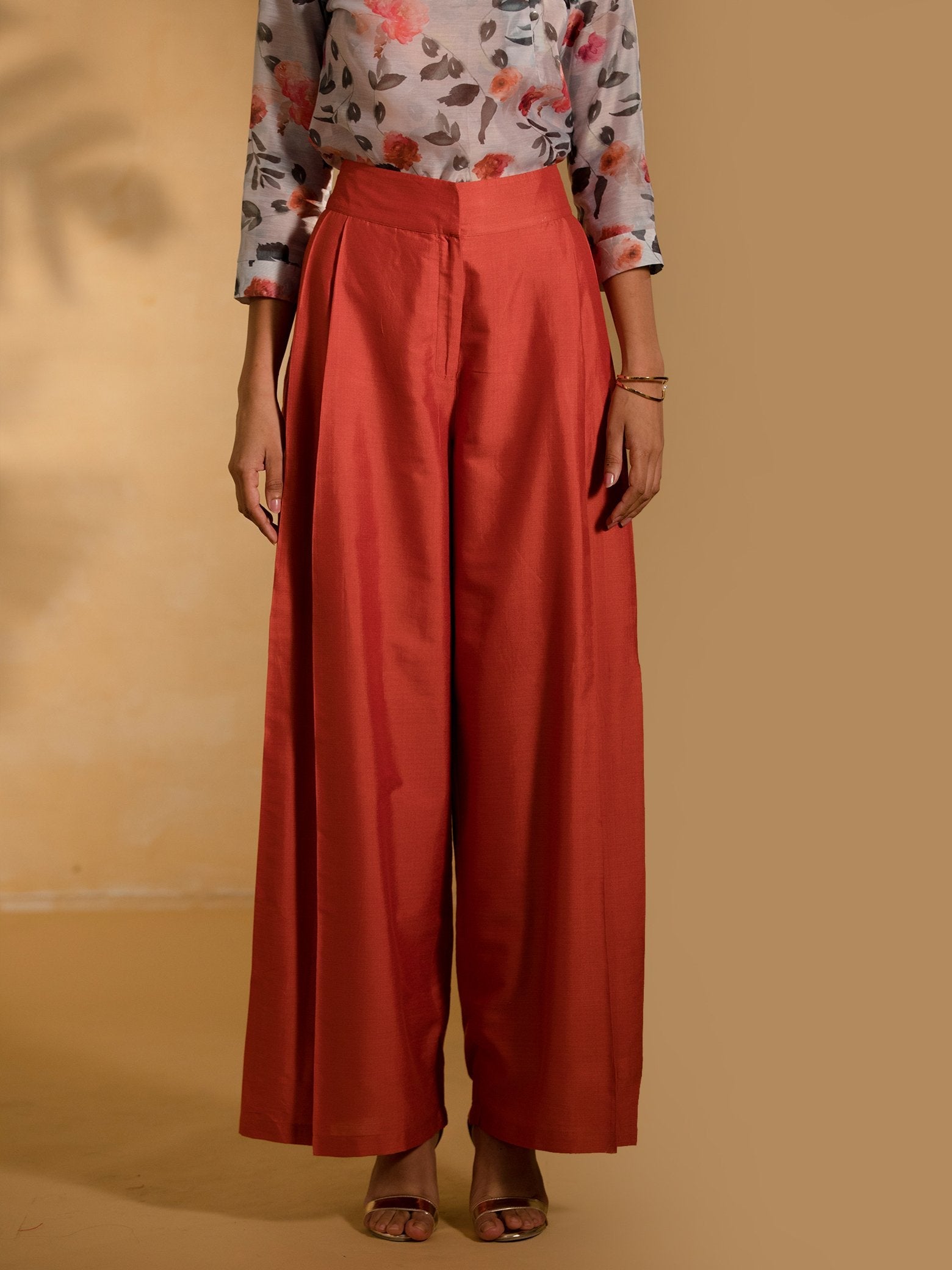 These rust, flared pants have pleats, pockets and Cotton-blend lining. Made using Cotton Silk, these are soft, lightweight and luxurious.
