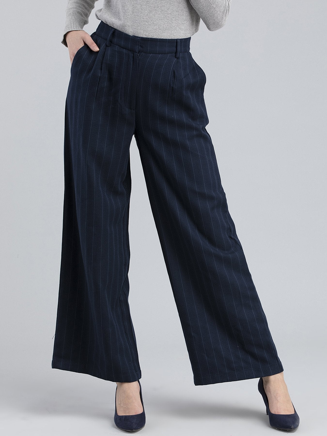 These navy, mid-rise, wide-legged pants have stripes, elasticated back, pockets and button & zip for closure. A Cotton Rayon Dobby blend, these are soft, breathable and comfortable.